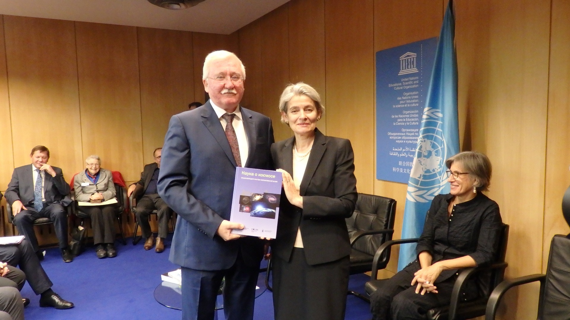 Экземпляр издания «Наука о космосе. Энциклопедия систем жизнеобеспечения» Игорь Ашурбейли преподнёс главе ЮНЕСКО. Октябрь 2016 г.