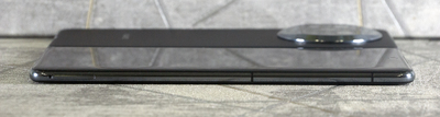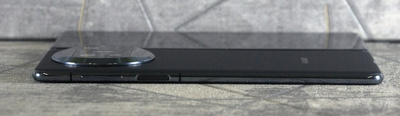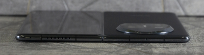 Металлические рамки по торцам напоминают хромированную нержавеющую сталь. Они достаточно маркие, но если на тонких гранях это менее заметно, то на левой рамке, прикрывающей шарнир, следы от пальцев видно хорошо. Благо, стираются они столь же легко. Неразделённую качельку громкости и плоскую кнопку включения производитель разместил на длинном торце половинки с камерой. Ожидаемо, что в плоскую кнопку встроен дактилоскопический сенсор, который во время использования работал без нареканий. На этой же половинке на торце сверху располагается ИК-датчик для управления различной техникой, а снизу идет отверстие микрофона и разъём USB-C 3.1 c с поддержкой режима Display Port 1.2 и OTG. Внешняя половинка с экраном оснащена на длинном торце слотом под две карточки nano-SIM, а сверху и снизу находятся отверстия динамиков и микрофонов.