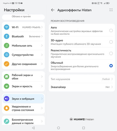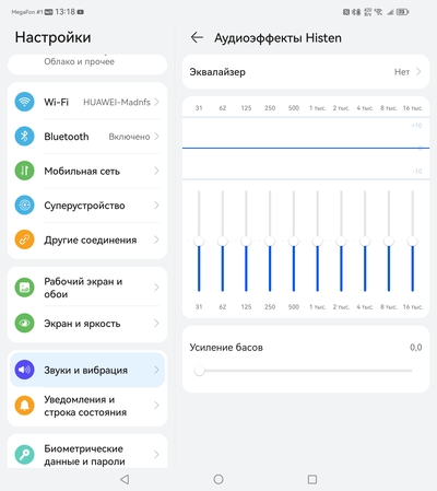 Настроек звука динамиков не предусмотрено, на как и на других моделях HUAWEI, есть параметры HUAWEI Histen для наушников, где пользователю доступно несколько интеллектуальных опций и 10-полосный эквалайзер. Набор HD-кодеков для беспроводных решений у смартфона ограничен только LDAC.