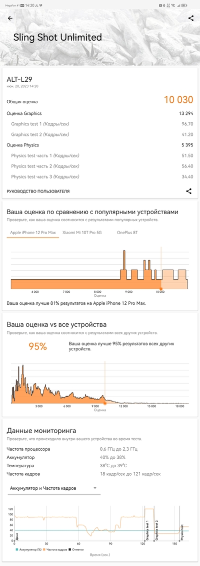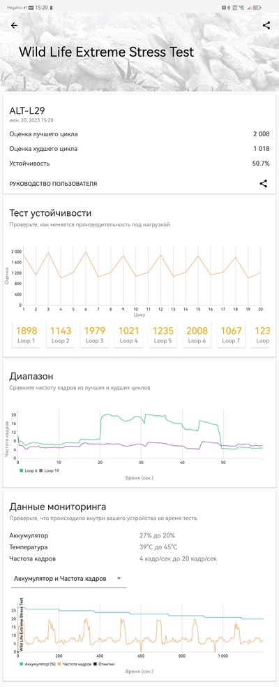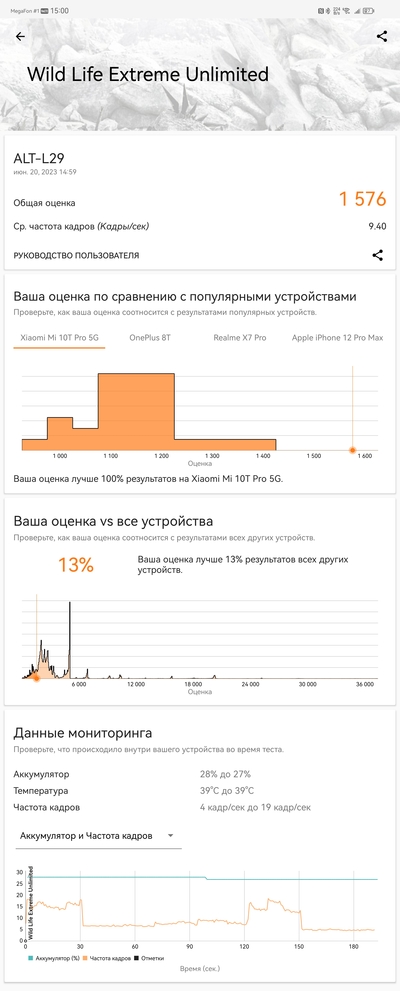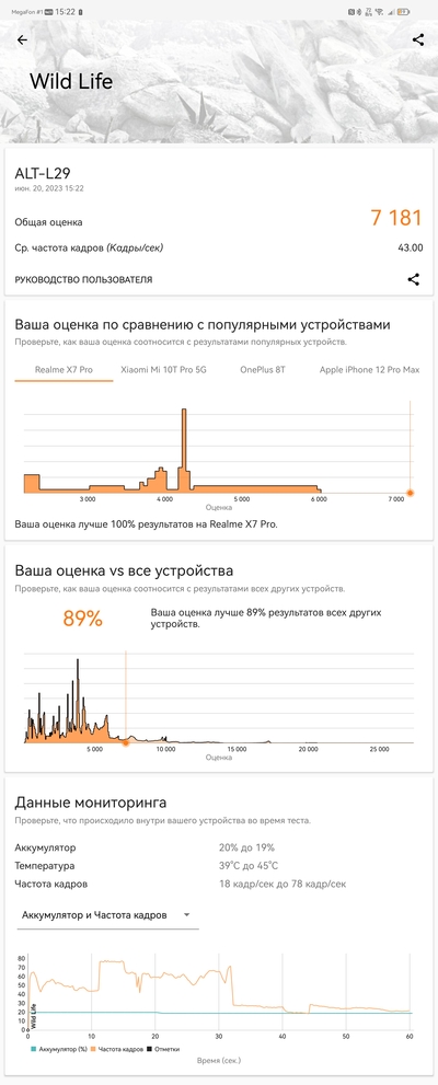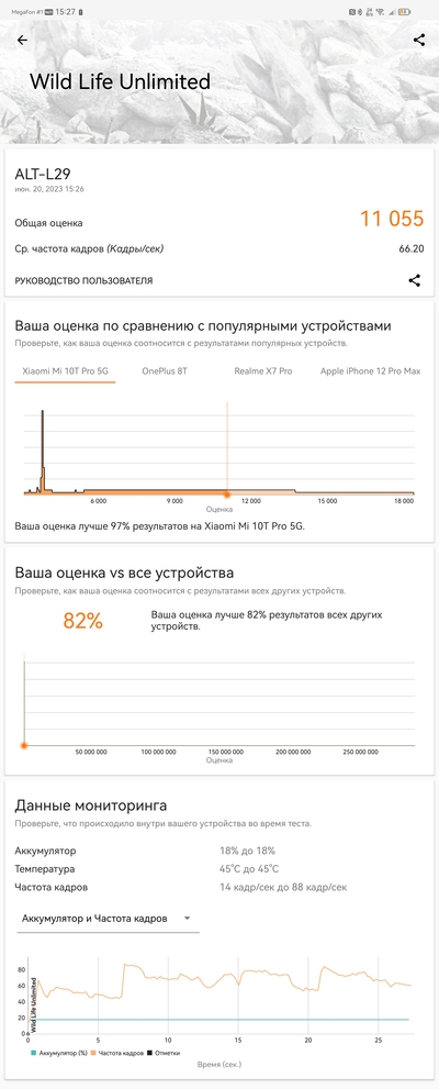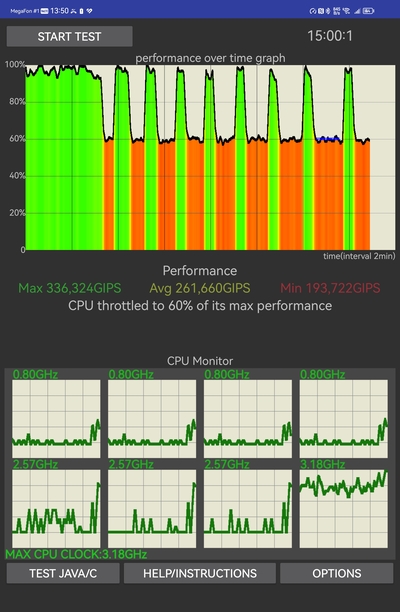 Что касается троттлинга процессора, то для смартфонов на Snapdragon 8+ Gen 1 это обычное дело, и естественно HUAWEI Mate X3 не стал исключением. В обычном режиме во время стандартного 15-минутного теста на троттлинг смартфон выдаёт максимальную производительность в течение первых 1,5 минут, а затем начинает снижать производительность примерно до 55% с периодичностью в 30 секунд - вплоть до конца теста.