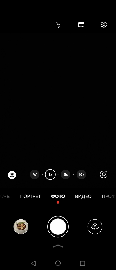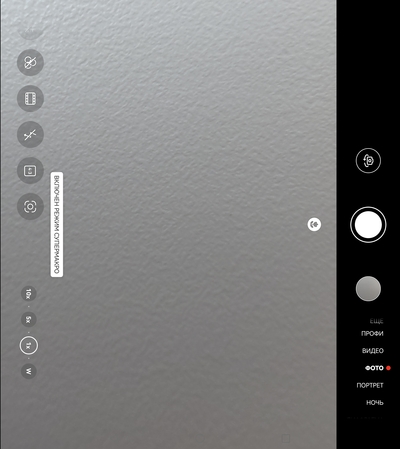 Первый - когда экран полностью раскрыт. В таком виде примерно 80% экрана с левой стороны занимает окно видоискателя, а 20% справа остаётся под тонкую панель с кнопкой затвора, переключение на фронтальную камеру, переход к просмотру последнего снимка и списка режимов в виде рулетки. На самом окне видоискателя с левой стороны находятся иконки смены фокусного расстояния (они же отвечают за смену объективов и зум) и другие опции в зависимости от выбранного режима. При смене на горизонтальное положение смартфона панель с кнопкой затвора и окно видоискателя не меняют своё положение. Иконки настроек и смены фокусного расстояние при этом также не меняют положение, но поворачиваются в зависимости от выбранного положения смартфона.