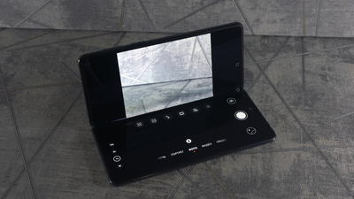Второй вариант - это полуоткрытый экран. Благодаря тому, что шарнир позволяет сохранить угол раскрытия в достаточно широком диапазоне, в приложении камеры это используется для ещё одного варианта интерфейса.