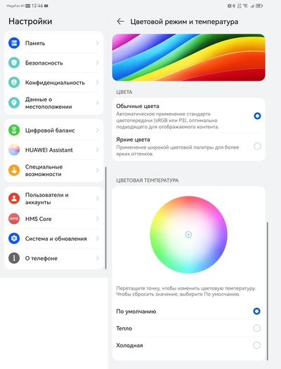 Что касается цветопередачи, то на обоих дисплеях она великолепна. Углы обзора отличные, цвета не меняются под любым углом просмотра. В режиме “Обычные цвета” выставленный в настройках по умолчанию цветовой охват практически полностью соответствует sRGB, в то время как режим “Яркие цвета” более насыщенный и приближается к охвату DCI-P3, но при этом значительно шире, чем sRGB.