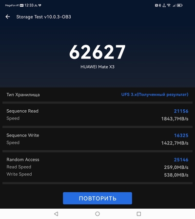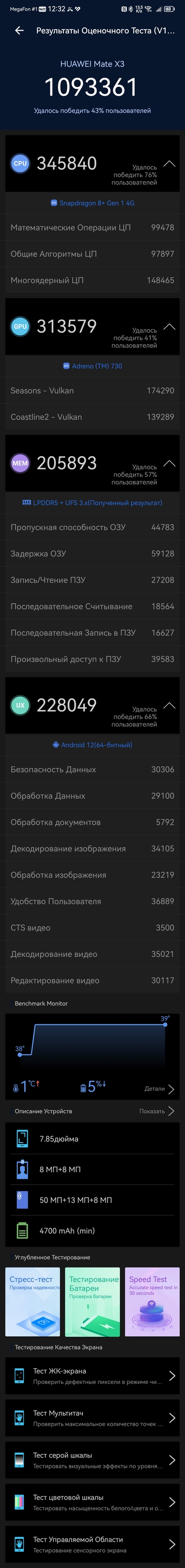 В базовых тестах AnTuTu и 3D Mark телефон определялся как HUAWEI Mate X3. В свежей 10-й версии AnTuTu смартфон набирает 1 093 361 очков: