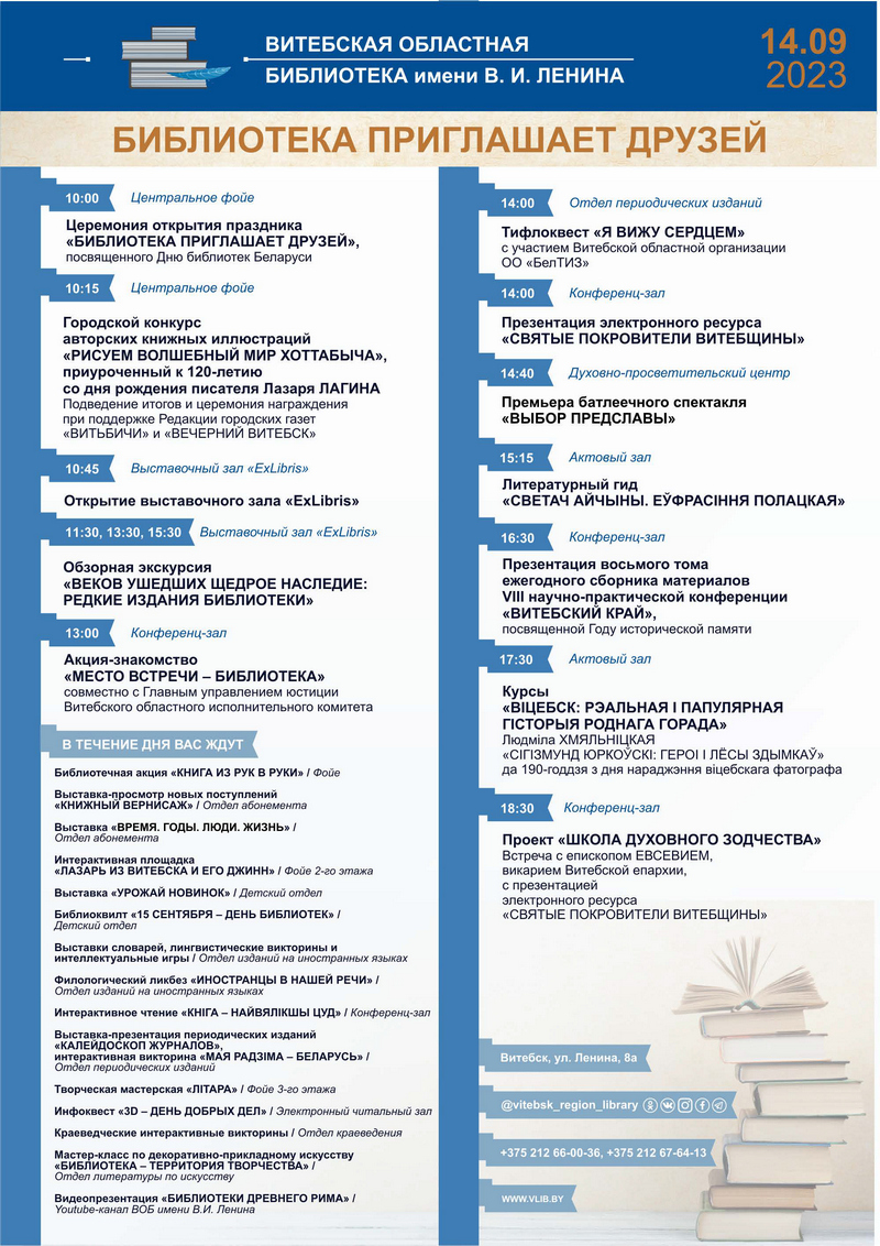 Витебская областная библиотека имени В. И. Ленина в рамках празднования Дня библиотек в Беларуси 14 сентября представит большую программу мероприятий для маленьких и взрослых читателей.