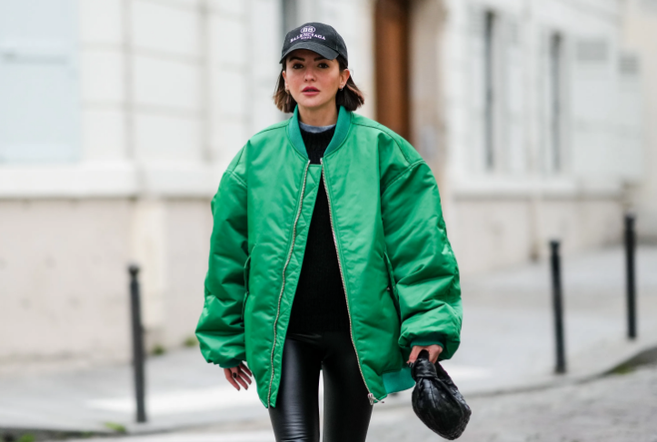 Кожаный и выполненный из эко-материала бомбер в сочетании с бесйсболкой и теплым джемпером или худи будет отличным вариантом для осенних дождей. Дополнить лук можно широкими джинсами или кожаными брюками.
