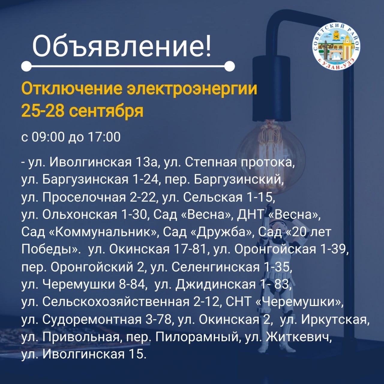 В Советском районе столицы Бурятии с 25 по 28 сентября будет отключена электроэнергия. Свет отключат в связи с проведением плановых работ.