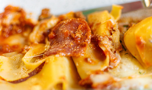 «Не могу сказать, что я фанатка лазаньи. Может просто потому, что нормальной лазаньи в моей жизни не было. Не было до этого обеда. Но вот я получаю просто огромную лазанью под огромной шапкой из сыра, которая купается в такой домашней (мне хочется в это верить) томатной пасте, с салями, с сыром опять же... И её так много. Но я съела всю. Несмотря на пиццу, которую уже покусала до этого. Остановиться было невозможно. Кажется, что во мне есть итальянские корни, и где-то в солнечной Сицилии живёт моя родная итальянская бабушка — такая сеньора в чёрном платье, которая громко разговаривает, много курит и по выходным готовит вот точно такую лазанью. Это не просто вкусно — это очень вкусно. Это топ. Это та еда, которую и надо называть едой, которую надо подавать гостям, которую хочется есть».