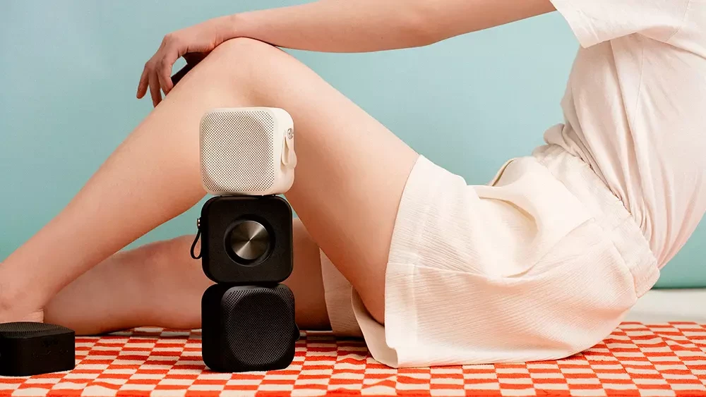 Минималистичная беспроводная колонка Sudio F2, представленная в белом и чёрном цветах, покрыта приятным на ощупь прорезиненным материалом, украшена эстетичными металлическими деталями и оснащена удобной ручкой, с помощью которой её можно прикрепить к сумке, рюкзаку, велосипеду или повесить на крючок в доме. Высокая степень защиты от влаги и пыли IPX7, а также небольшой вес, всего 410 г, позволяют брать колонку с собой в душ, на пляж или на дачу. Устройство работает до 15 часов на одном заряде аккумуляторов.
