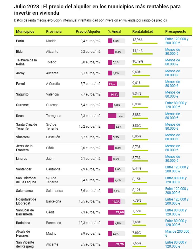 По данным Idealista за второй квартал, средняя валовая рентабельность покупки жилья для сдачи в аренду составляет в Испании 7,1%, а компания Masteos, специализирующаяся на инвестициях, заявляет, что в некоторых локациях можно получить более 8%, вложив менее 80 000 евро на покупку. Среди таких, например, Талавера-де-ла-Рейна, Алькой, Феррол, Реус или Санта-Крус-де-Тенерифе.
