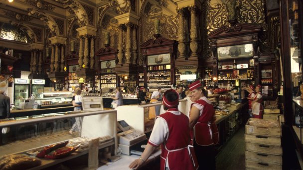 В застойные годы «Елисеевский» постепенно ветшал вместе с руководством страны. Огромный двухсветный зал с кое-где облупившейся позолотой и помутневшими от времени зеркалами по-прежнему освещали хрустальные люстры с разномастными лампочками. Рисунок пола, выстланный метлахской плиткой, почти стерся, но по нему по-прежнему ежедневно ходили сотни ног покупателей. Москвичи приезжали в «Елисеевский» за продуктами к праздничному столу и терпеливо выстаивали несколько очередей, вдыхая смесь любительской колбасы, обжаренного кофе и ванильной сдобы. Главными в программе были 150 г осетрины с прозрачным желтоватым жирком, которую продавщица в кружевной наколке нарезала тончайшими ломтиками и заворачивала в вощеную бумагу, а также песочная корзиночка с розочкой из крема за 22 копейки.