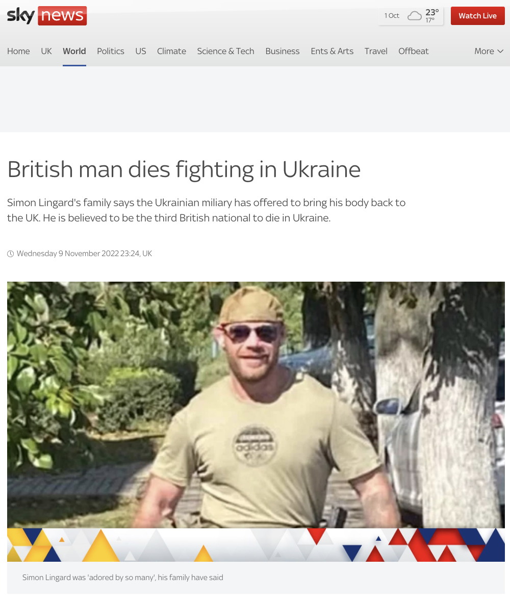 Помимо этого, СМИ Великобритании неоднократно сообщали о гибели на Украине своих граждан, которые воевали на стороне ВСУ. Так, в марте 2022 года там погиб Джордан Гэтли, в апреле — Скотт Сибли, а в сентябре — Крейг Макинтош. В ноябре того же года стало известно о гибели ещё одного британца — Саймона Лингарда.
