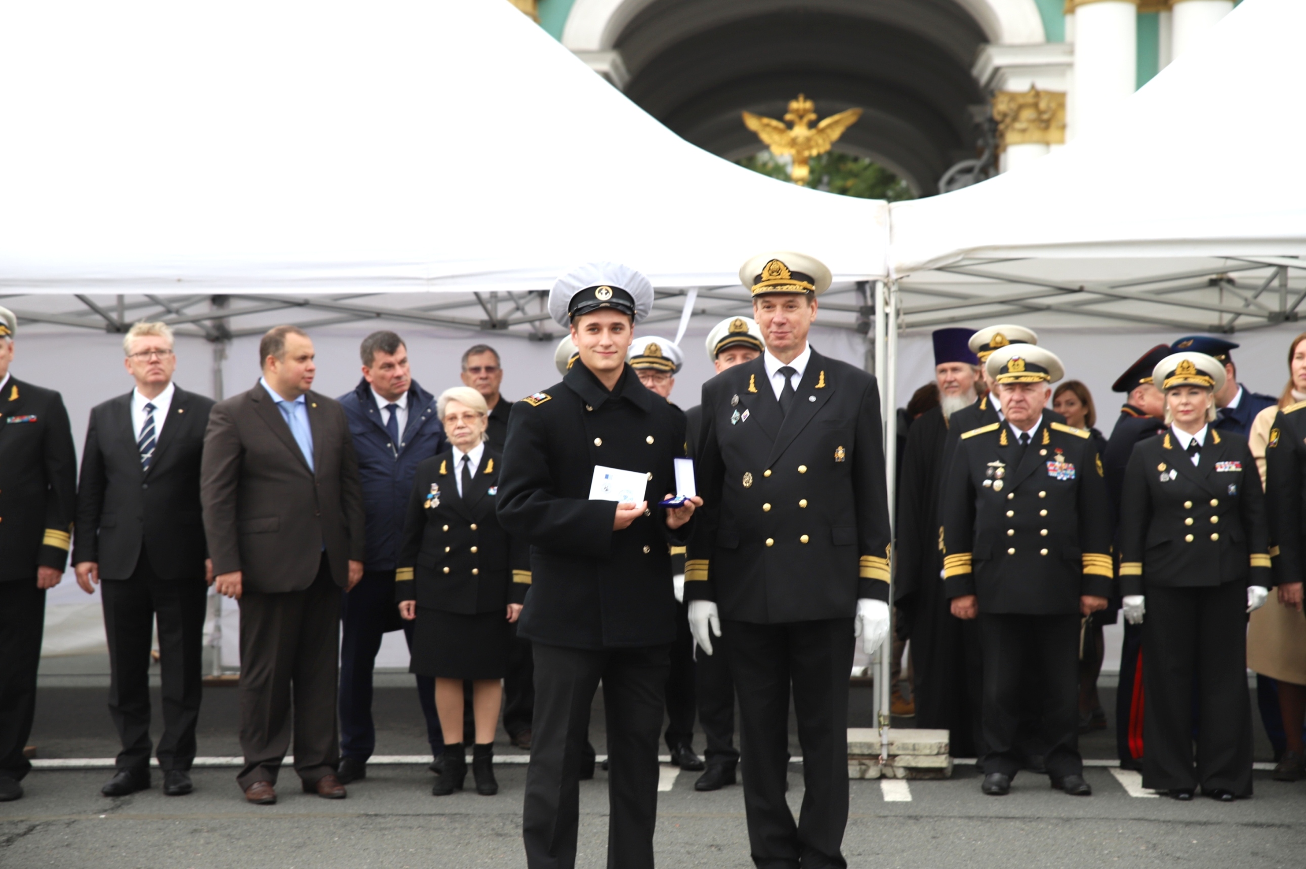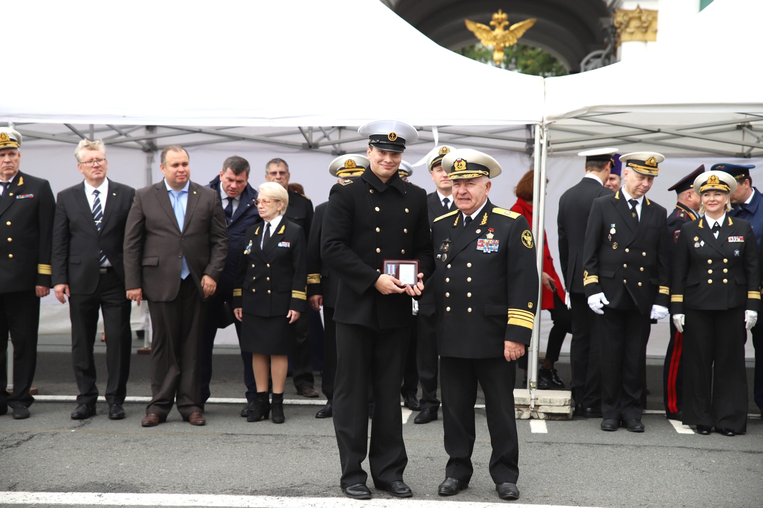 Президент некоммерческого партнерства «Транспортный союз Северо-Запада», член Попечительского совета ГУМРФ, выпускник Макаровки 1953 г. Владимир Ходырев отметил, что Макаровка дает выпускникам мощный импульс, и пожелал ребятам двигаться вперед. От имени Законодательного собрания Санкт-Петербурга выступил депутат Константин Чебыкин и сказал, что главное - это морская дружба, которую курсанты обретут в университете на всю жизнь.
