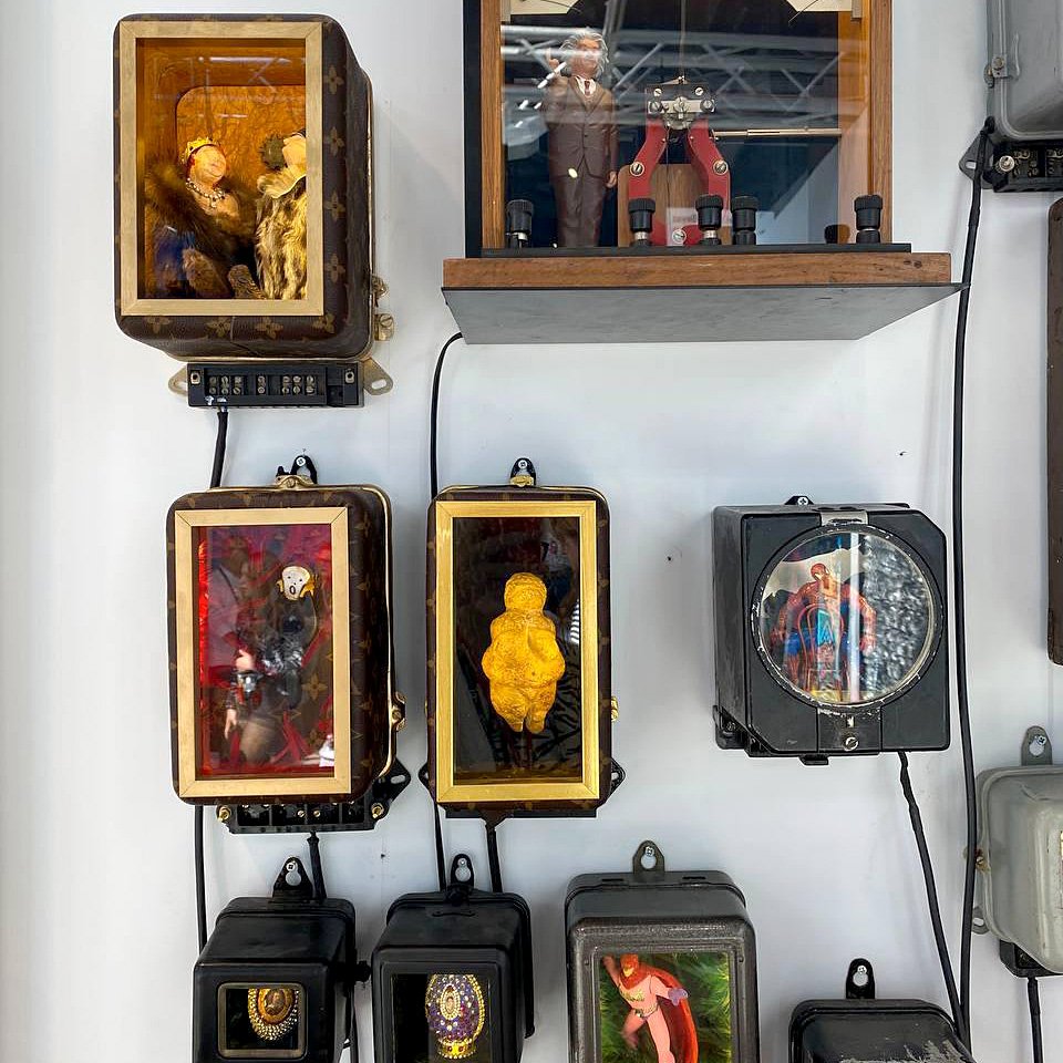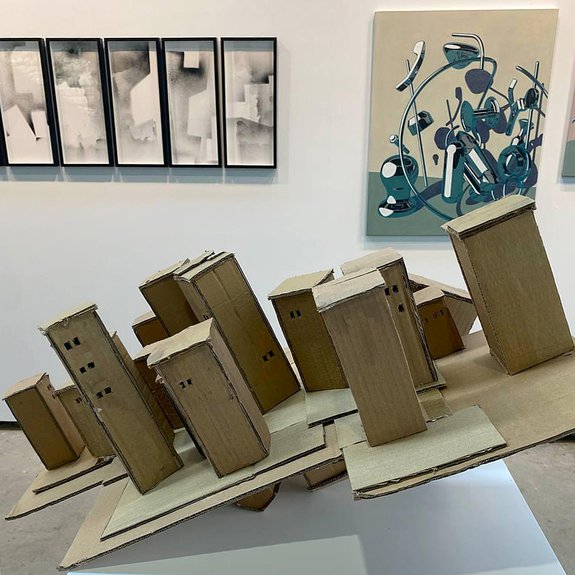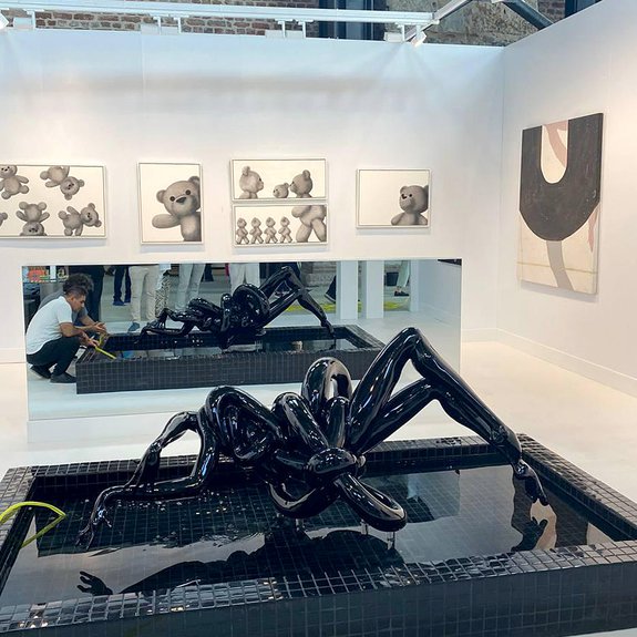 На ярмарку приехали и российские галереи. Десять лет назад, в 2013 году, их было целых семь (это был специальный фокус на русском искусстве), в прошлом году — ни одной, в этот раз их две, и обе из Москвы. Это новая Sistema Gallery, представившая нескольких молодых художников, среди работ которых выделялись эффектные сюрреалистические объекты из массива дуба Славы Нестерова, напоминающие барочные рамы со встроенными в них винтажными фото и снабженные пространными поэтическими названиями. И галерея Omelchenko Gallery с инсталляцией художницы Кати Дорониной (@mojjoker), которая, по ее собственным словам, «пришла из мира дизайна». В инсталляции по мотивам «Гамлета» два стола, похожие на бильярдные, с керамическими плашками-вставками и несколько картин-схем, расписывающих, от чего и как умерли герои шекспировской пьесы. Самый дорогой из столов оценивается в €18 тыс.