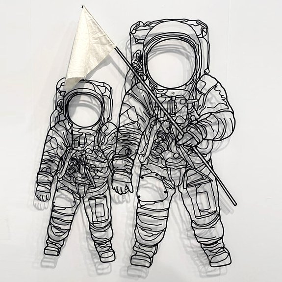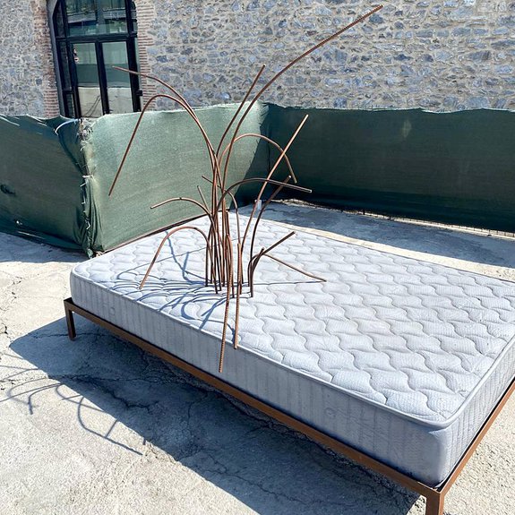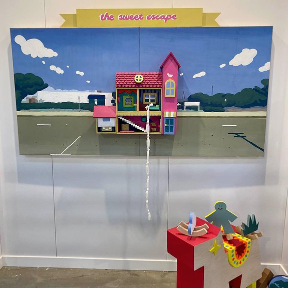 Многие же работы не нуждаются в переводе. Например, металлический рельеф с двумя фигурами космонавтов в скафандрах (взрослый и ребенок), выбрасывающих белый флаг, — так художник Фрэнк Плант видит «Беженцев будущего» (галерея Soda). Или скульптура в духе Джеффа Кунса, изображающая черно-белый сдувшийся спасательный круг, турецкого художника Мехмета Али Уйсала на стенде Pi Artworks. Он известен своими паблик-арт-проектами. Его же софа с торчащими из матраса железными прутьями — арматурой участвовала в проходившей в третий раз уличной выставке «Двор» (The Yard) на площади перед ярмаркой, для которой куратор Марк-Оливье Уолер отобрал девять скульптур и инсталляций разных художников: огромный череп со змеиным языком, деревянную башню, качели и прочие остроумные конструкции.