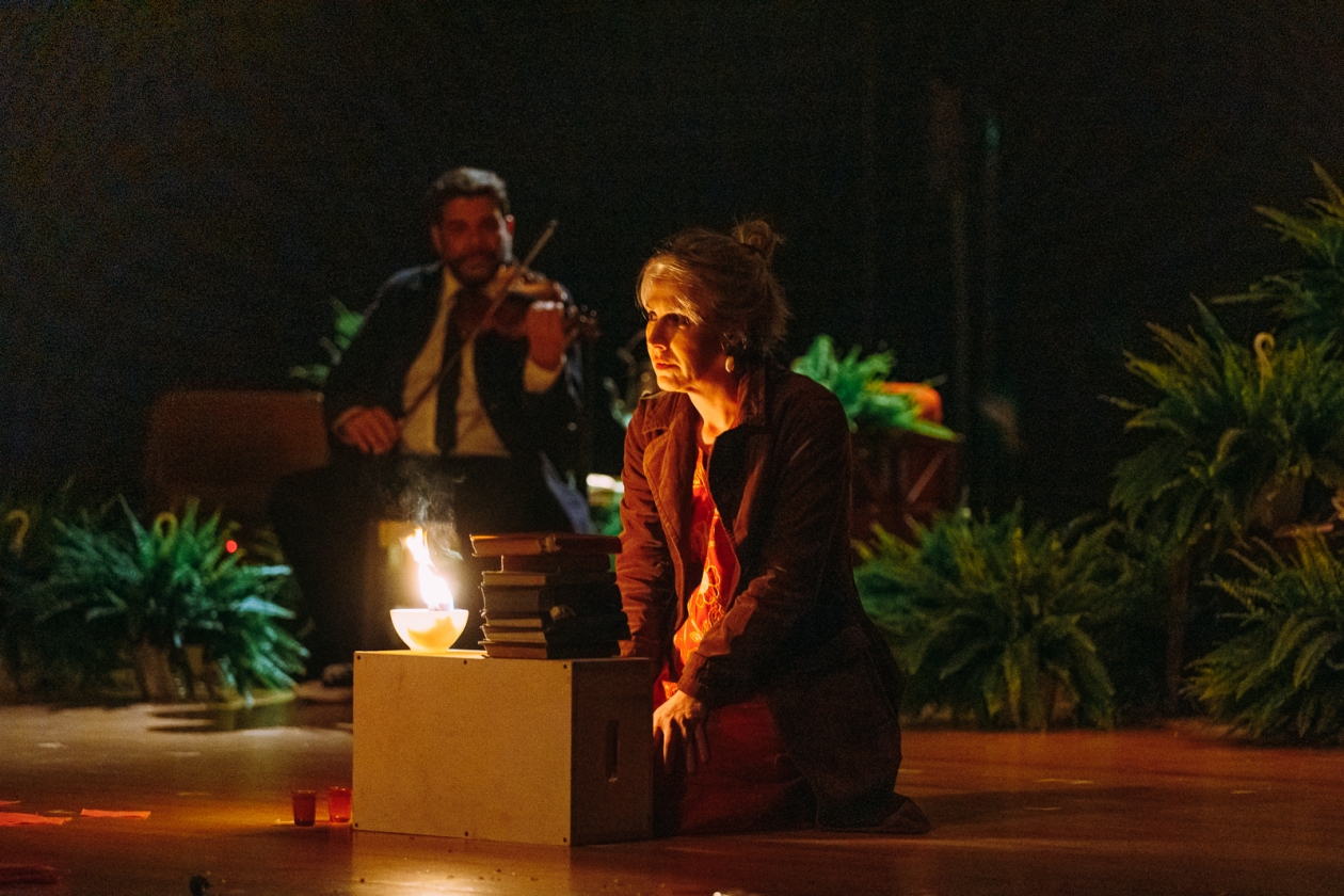 Ну и апофеоз — бразильский карнавал. Ольга, Маша и Ирина раздают зрителям фонарики-сердечки на шнурке и показывают, что с ними делать: вращать на манер пращи — в зале то там, то здесь под ритмичную бразильскую музыку возникают светящиеся разноцветные круги. На сцене гаснет свет. Играет музыка. И вдруг обрывается. Тишина. Темнота. Пауза. Свет возвращается на сцену. Но это другой свет — свет зарева. Ольга рассказывает о том, что в гимназии, которой она руководит, сгорела библиотека. Она вырывает из книги лист, кладет его в чашку и поджигает. Устраивает пожар, Пусть даже в миниатюре. И лицо ее перепачкано подлинной сажей.