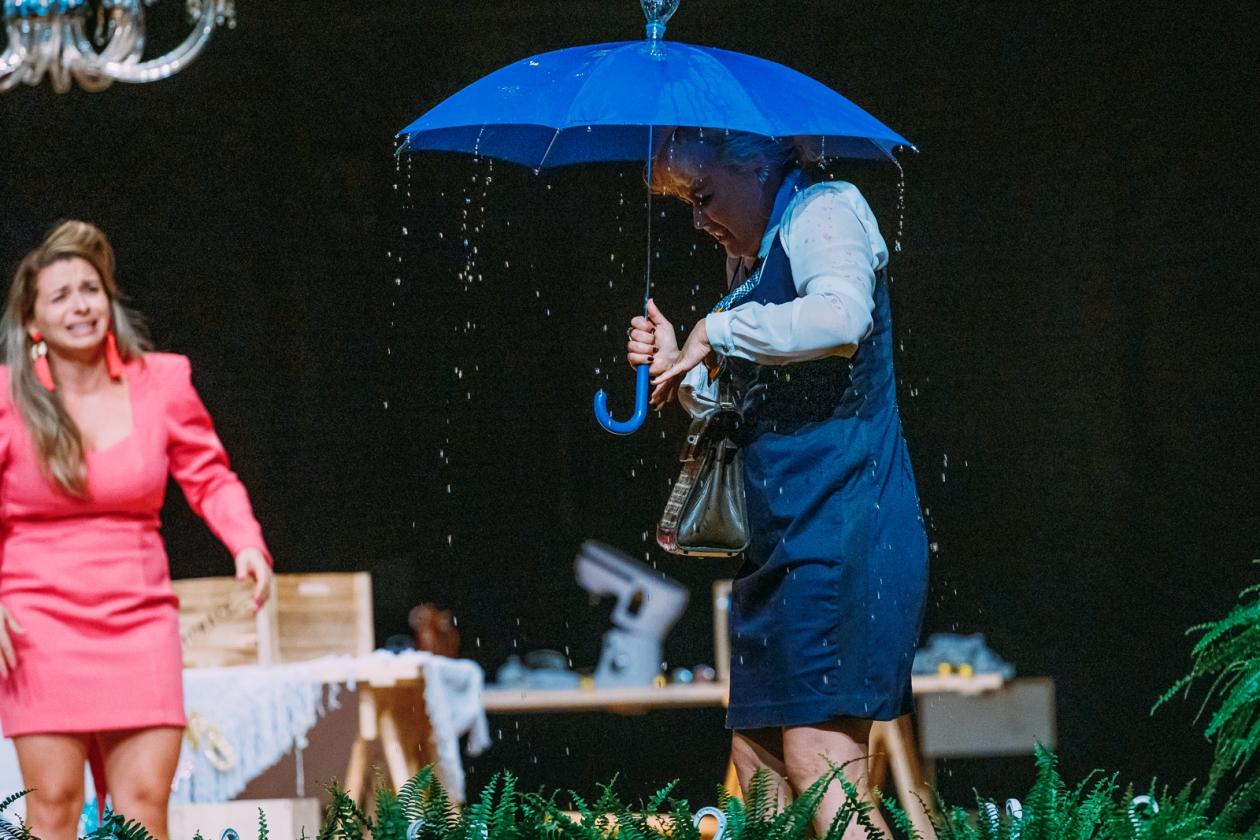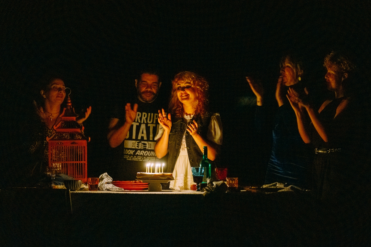 Но это здесь, в Малом зале Приморской Мариинки. В Бразилии спектакль играют круче. Зрителей (человек 25) — рассаживают прямо на диванах, стульях и табуретах в реальной гостиной или на кухне. Иногда зрители занимают еще и лестницу, ведущую на балкон. Артистки готовят праздничный ужин в честь дня рождения младшей сестры Ирины, накрывают на стол, едят и пьют сами и угощают едой и напитками зрителей, тем самым превращая их в гостей aniversário. И, как это часто бывает в разгар застолья, не обращая внимания на посторонних людей, находящихся на расстоянии протянутой руки, начинают обсуждать свои личные и семейные проблемы. При этом могут наступить гостю на ногу, извиниться, улыбнуться, перекинуться парой слов, поднести рюмочку.