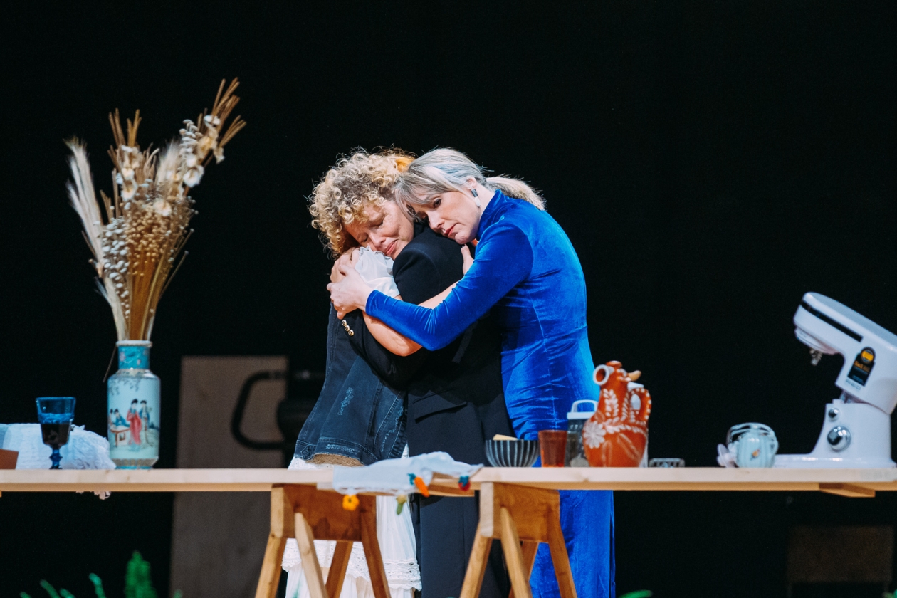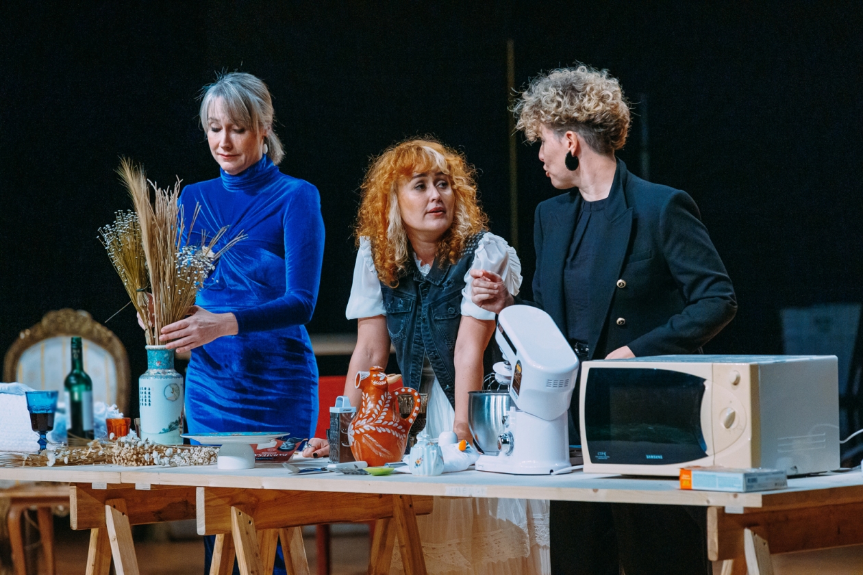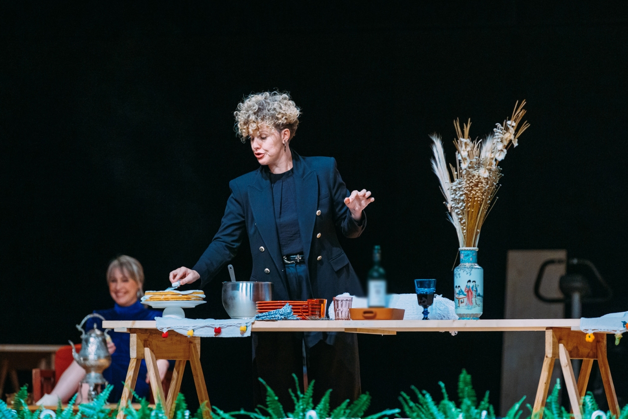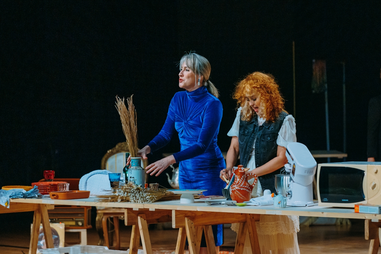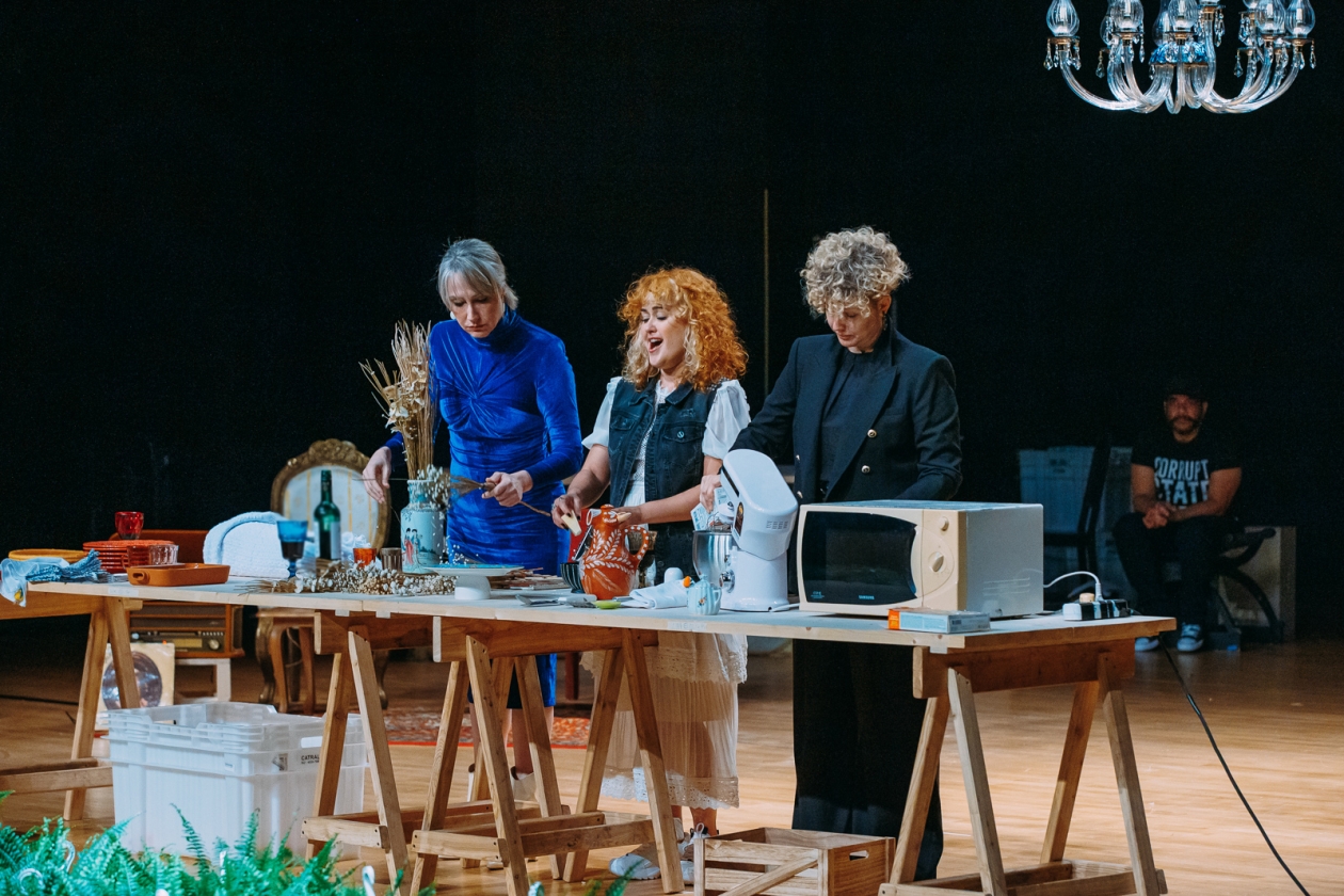 В спектакле бразильской труппы таких точек соприкосновения было несколько. Актрисы готовили торт (правда, торт для ленивых, когда купленные в магазине готовые вафельные коржи кладут один на другой, промазывая их кремом). Но крем для торта сбивали прямо на сцене, используя кухонный комбайн.