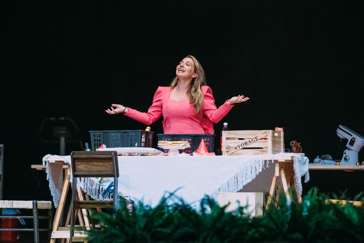 … Где-то в середине спектакля сама собой возникла развернутая метафора: какая-то шумная компания приезжает на песчаный пляж, выгружает шезлонги, складные столики и большие зонты, расставляет все это, достает корзины с едой и напитками, рассаживается в позе отдающих и ждет.