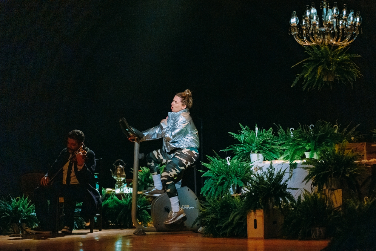 Третье появление — финал. Полное завоевание дома Прозоровых. Наташа в камуфляже травяного цвета крутит педали на велотренажере, и кажется, что она пропускает всю прежнюю жизнь мужа и его сестер через мясорубку. Декоративная пластиковая трава, которая в начале спектакля занимала просцениум, теперь переместилась в глубину сцены — она на столах, на стульях, на пианино, на котором играл Педро, везде, где только можно.