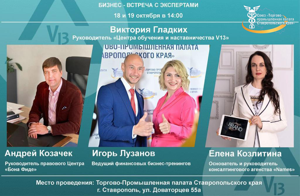 В Торгово-промышленной палате Ставропольского края 18 и 19 октября 2023 г. состоится бизнес-встреча с экспертами в лице членов бизнес-сообщества.