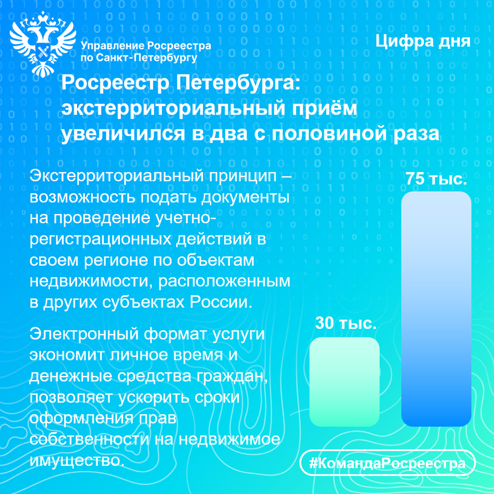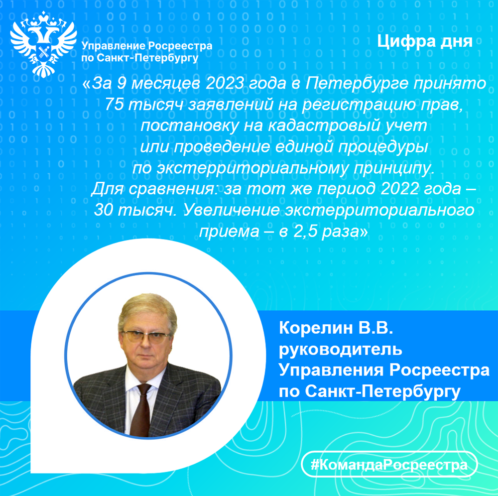 «За 9 месяцев 2023 года в Петербурге принято 75 тысяч заявлений на регистрацию прав, постановку на кадастровый учет или проведение единой процедуры по экстерриториальному принципу. Для сравнения: за тот же период 2022 года – 30 тысяч. Увеличение экстерриториального приема – в 2,5 раза».
