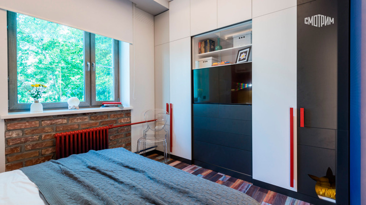 Узкие шкафы-колонны по обе стороны довели дом ума: установили полки и выдвижные ящики. А фасады колонн украсили силуэтами Марины и Алексея – необычный декор сразу привлекает к себе внимание. Что касается цветовой гаммы, то дизайнер сделал ставку на цвета, которые чаще всего встречаются на картинах Политовых, – красный, синий, желтый.