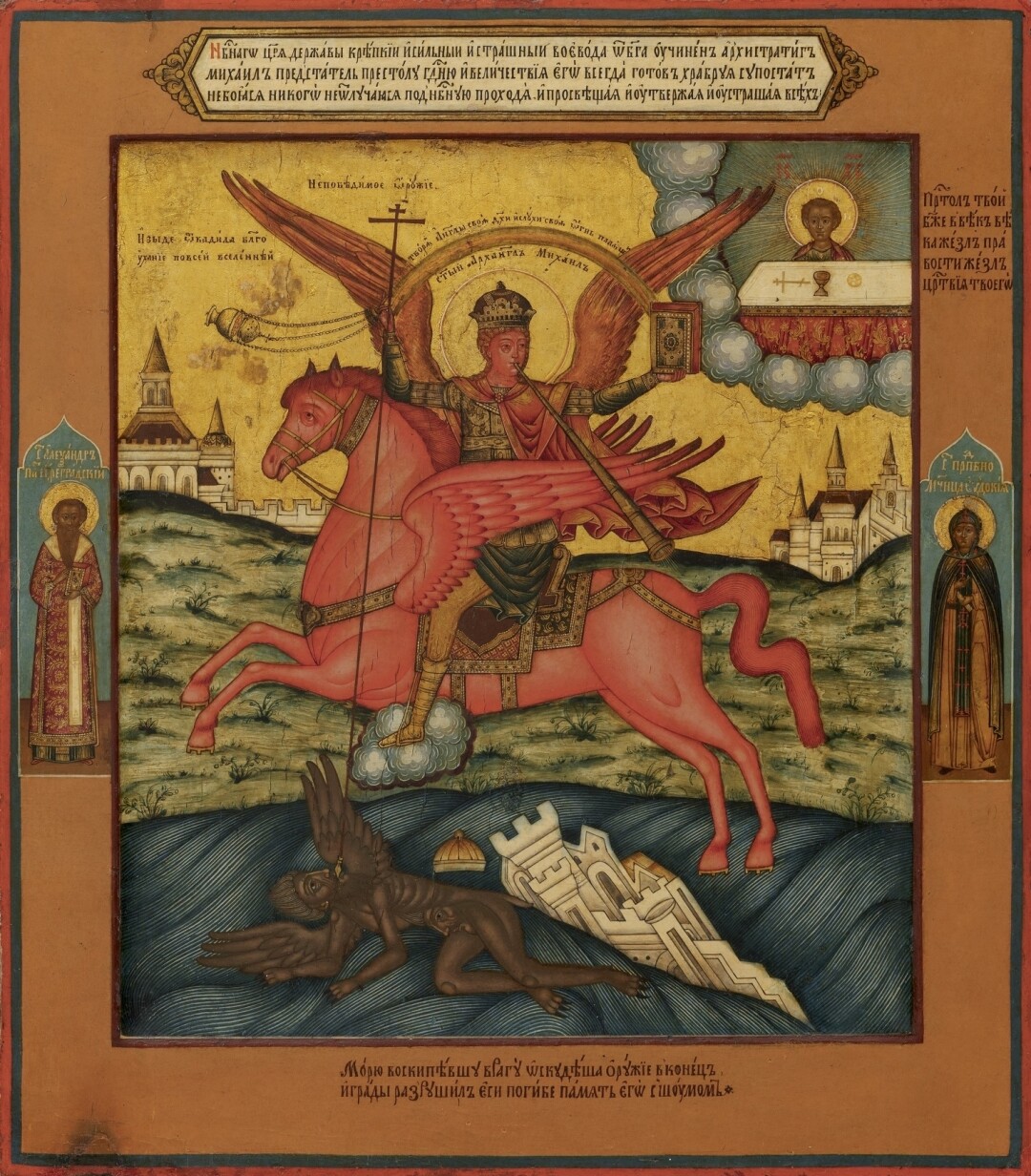 Икона «Архистратиг Михаил, грозных сил воевода, со святителем Александром Цареградским и преподобномученицей Евдокией». Выг. 1770–1780-е.