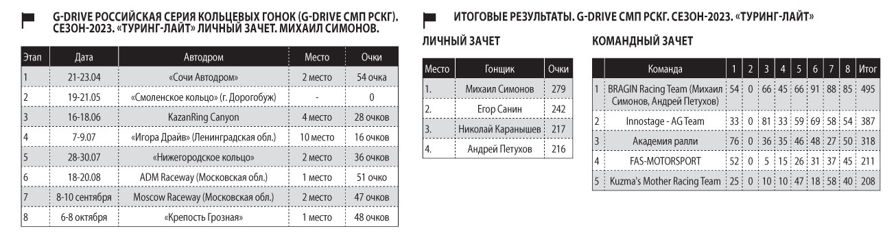— Да. Причем мы въехали в этот чемпионат на автомобилях, никогда ранее не выступавших в Российской серии кольцевых гонок — «Шкодах». И, знаете, автомобили показали себя прекрасно. Но не потому что они «Шкоды», а потому что нам удалось их настолько оптимально настроить и оптимизировать, что сезон-2023 для нашей команды BRAGIN Racing Team и меня стал на сегодняшний день лучшим с точки зрения настройки автомобиля и прогресса.