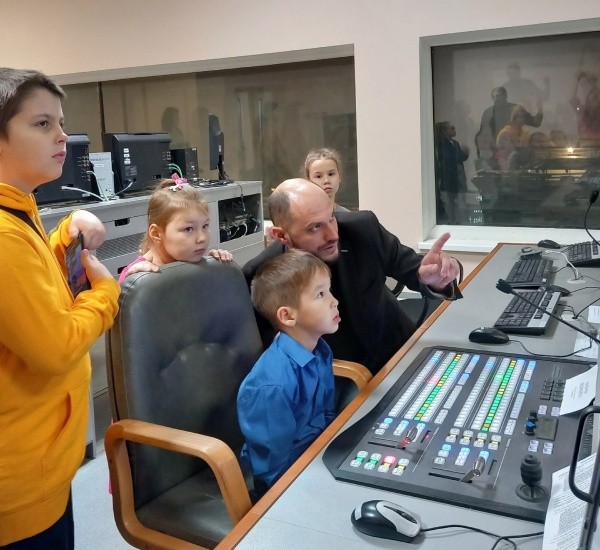 Ребят встретили радиоведущий Константин Мягчилов и телеведущая Юлия Чемоданова. Дети погуляли по зданию телерадиокомпании и увидели, как создается телевидение. Также они узнали о работе теле- и радиоведущих и корреспондентов, познакомились с трудовыми обязанностями звукорежиссеров, операторов и режиссеров. Юные гости смогли примерить на себя роль ведущего и поработать в кадре, посидеть за пультом и в радиостудии.