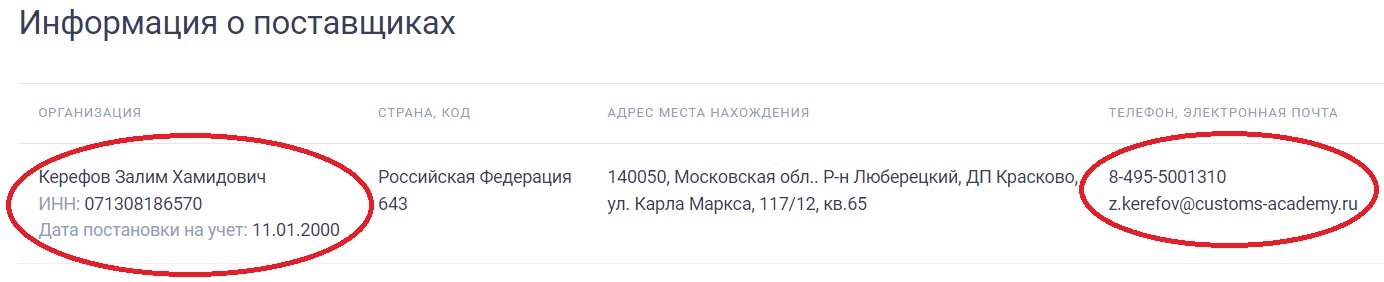 При этом Керефов Залим Хамидович успел в 2015-м оформить ещё одно ИП – в дачном посёлке Красково, тоже в Люберцах, но профиль, совсем далёкий от IT и компьютеров: основное направление деятельности – разведение птицы, а также выращивание сельхозкультур. И хотя деятельность велась всего пару лет (до 19 июля 2017 года), каким-то образом уже после закрытия фирма Керефова успела оказать всё той же Таможенной академии, в рамках госконтракта от 5 апреля 2018-го, услугу "по дополнительному профессиональному образованию" – на 930 тысяч рублей.