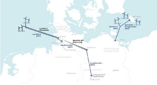 В соответствии с заключенными 50Hertz договорами будут проложены КЛ суммарной протяженностью около 3500 км для 7 HVDC соединений напряжением 525 кВ и пропускной способностью 2 ГВт каждое. В объем работ по заключенным договорам входят проектирование, производство и поставка КЛ, а также все работы по прокладке КЛ в море и на материке.