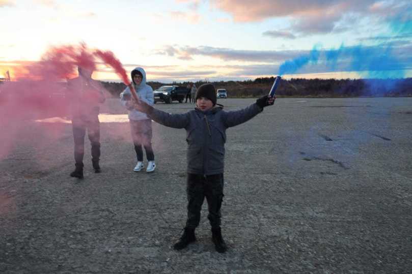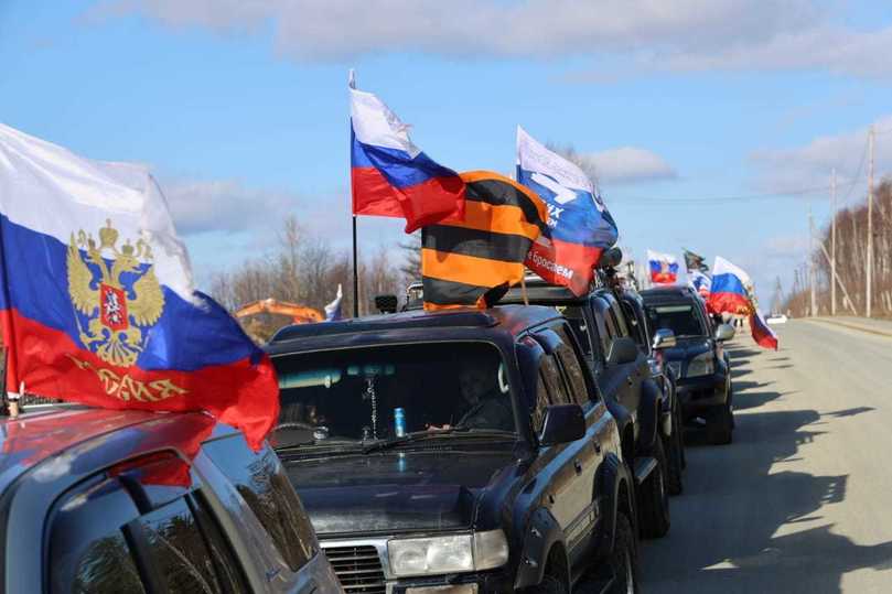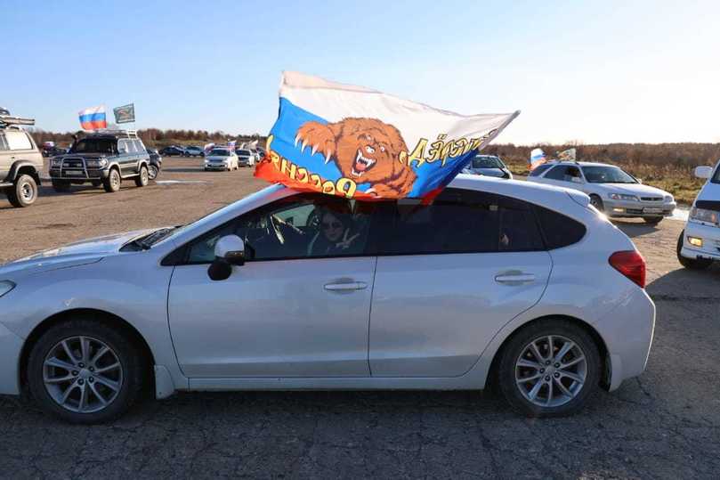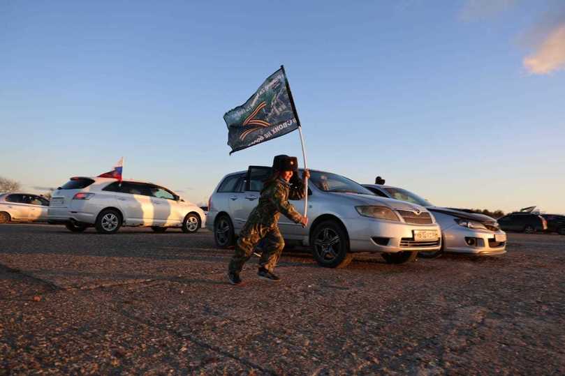 В 15:00 сотни машин выдвинулись из Южно-Сахалинска на аэродром Пушистый. Автомобилисты украсили машины тематическими флагами. Солдатская каша, плов и горячий чай согревали патриотически настроенных участников мероприятия.
