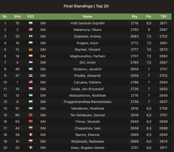 Победителем этого года, как уже упоминалось, стал гроссмейстер из Индии Сантош Видит, набравший 8,5 очков. Вторую путёвку в турнир претендентов завоевал американец Хикару Накамура с 8 очками.