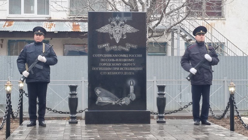 Напротив здания Соль-Илецкого отдела полиции прошло торжественное открытие памятного камня сотрудникам ОМВД России по Соль-Илецкому городскому округу, погибшим при исполнении служебных обязанностей. Инициатива создания мемориала принадлежит руководству и личному составу Соль-Илецкого отдела полиции. Неравнодушные местные жители поддержали идею и оказали содействие в ее воплощении.