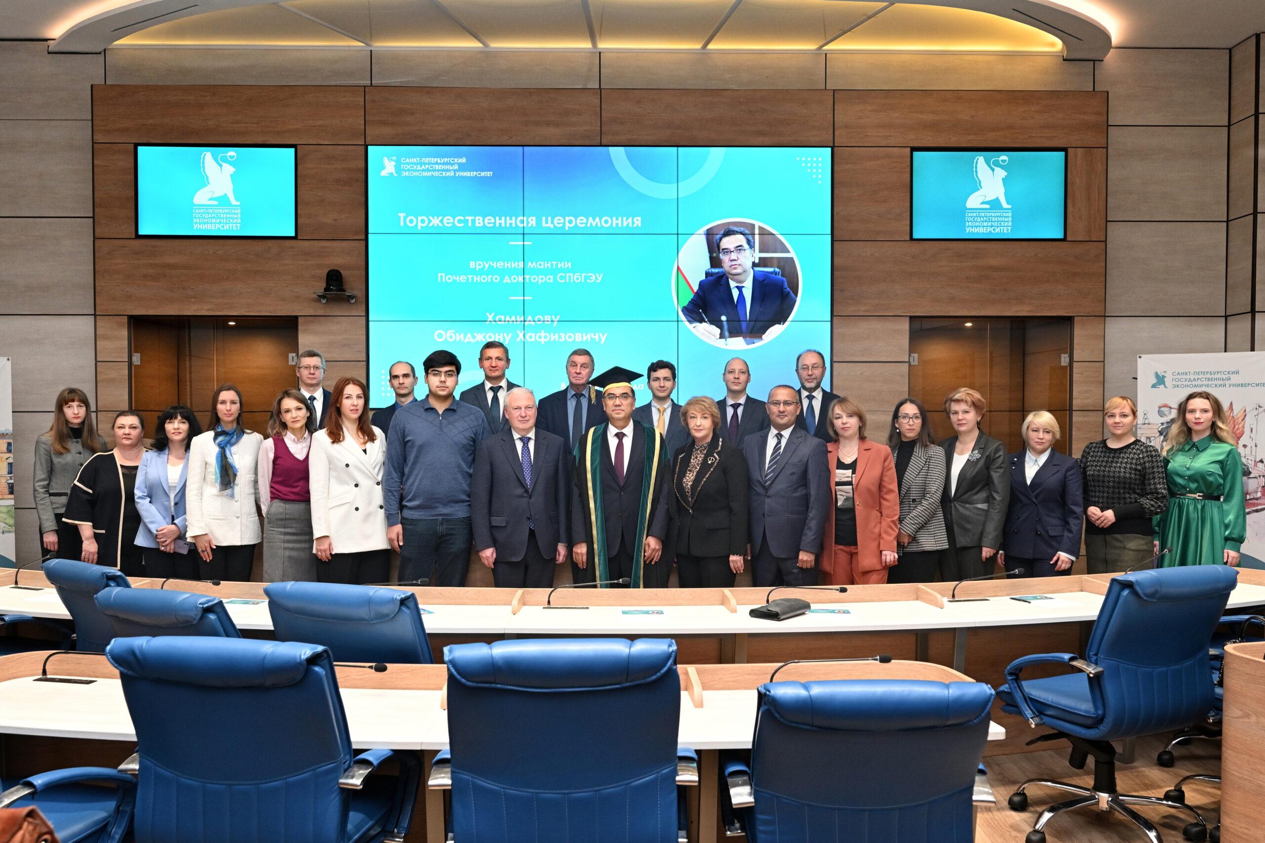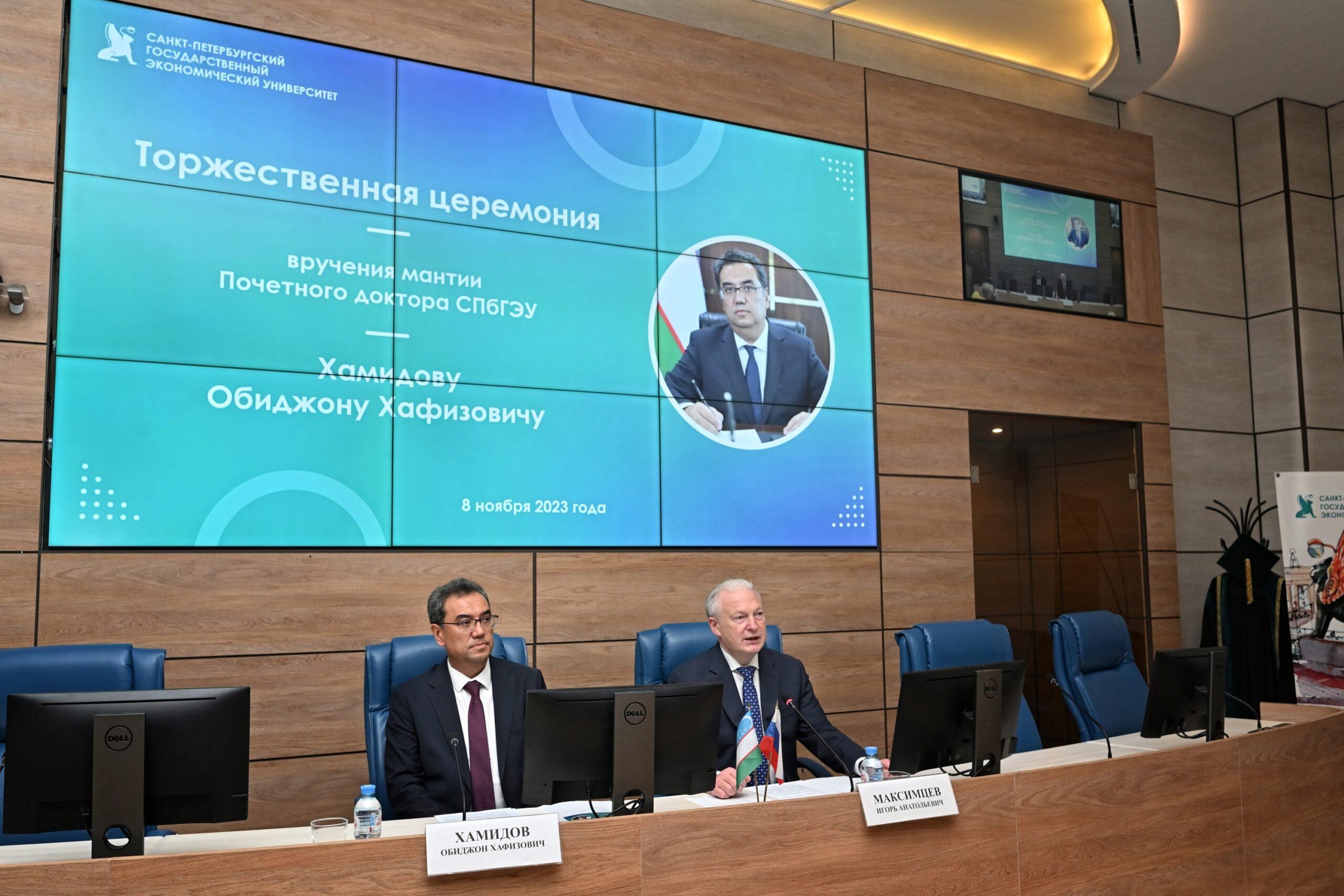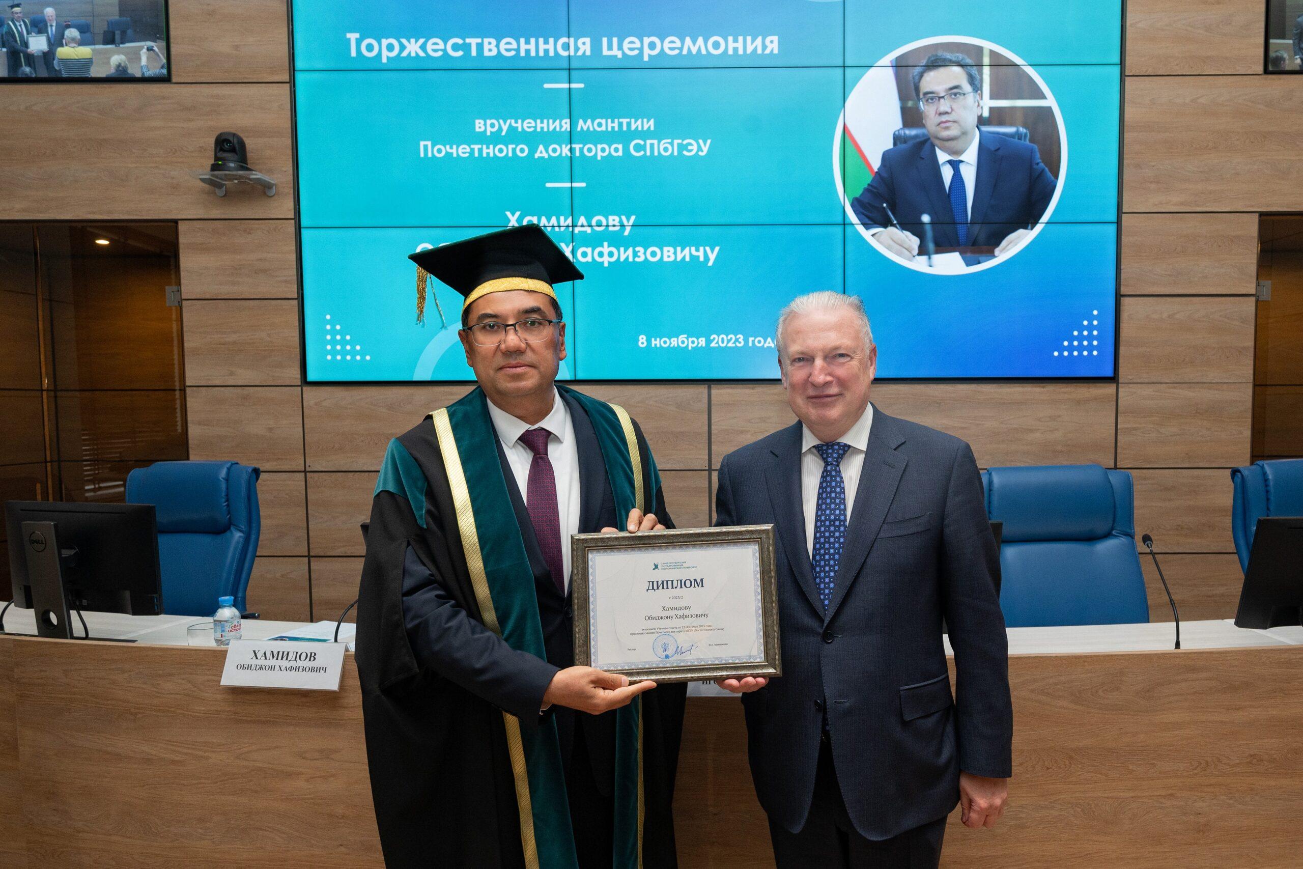 8 ноября на торжественной церемонии ректор Игорь Максимцев вручил мантию Почетного доктора Санкт-Петербургского государственного экономического университета (Doctor honoris causa) Обиджону Хамидову, ректору Бухарского государственного университета.