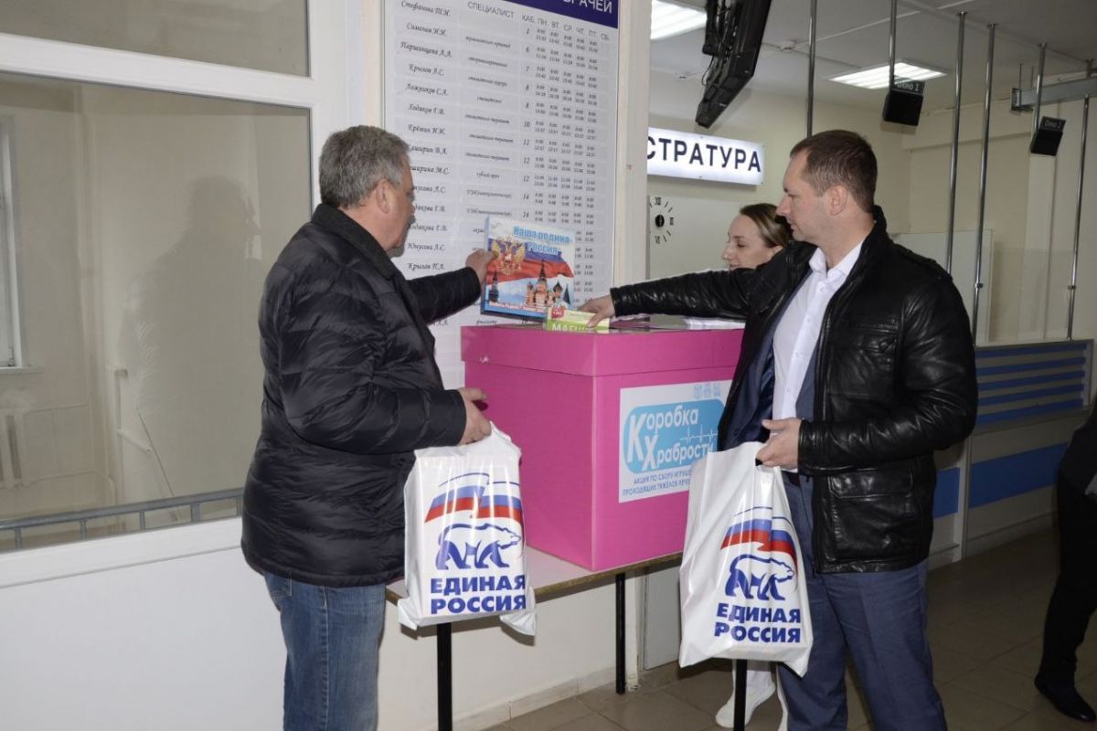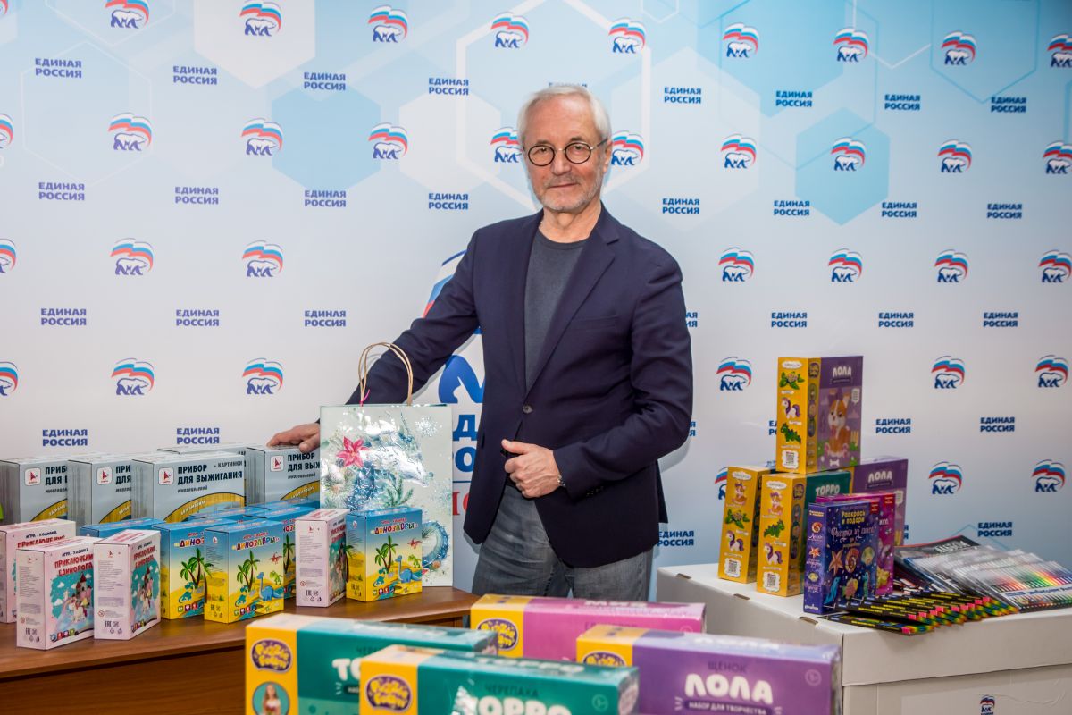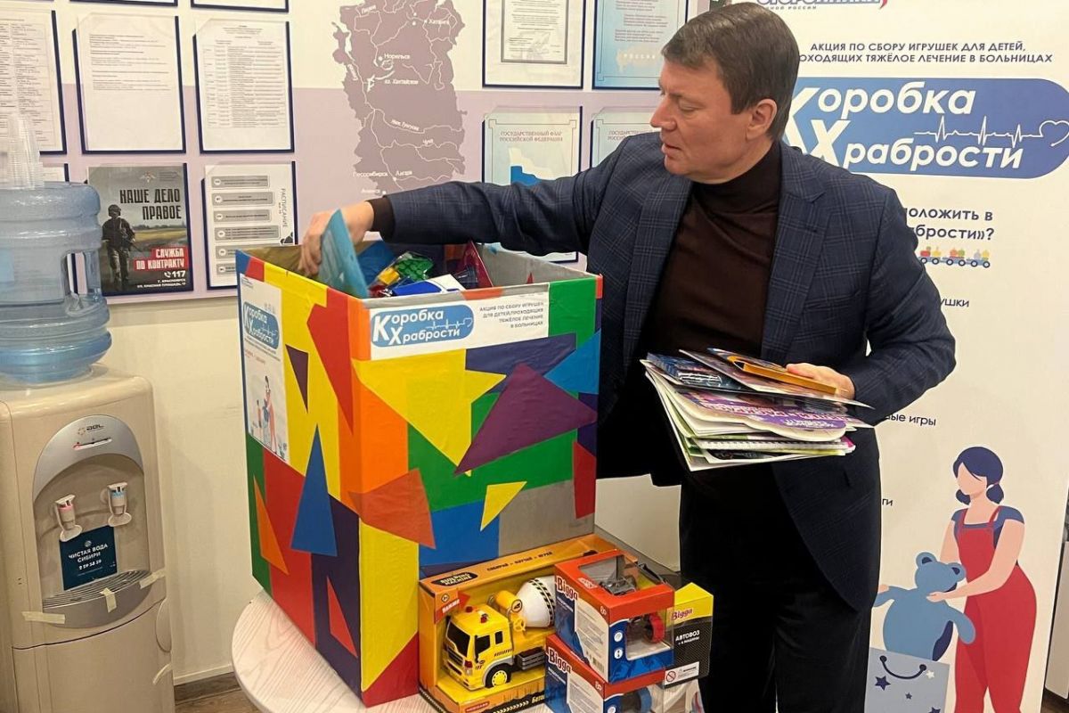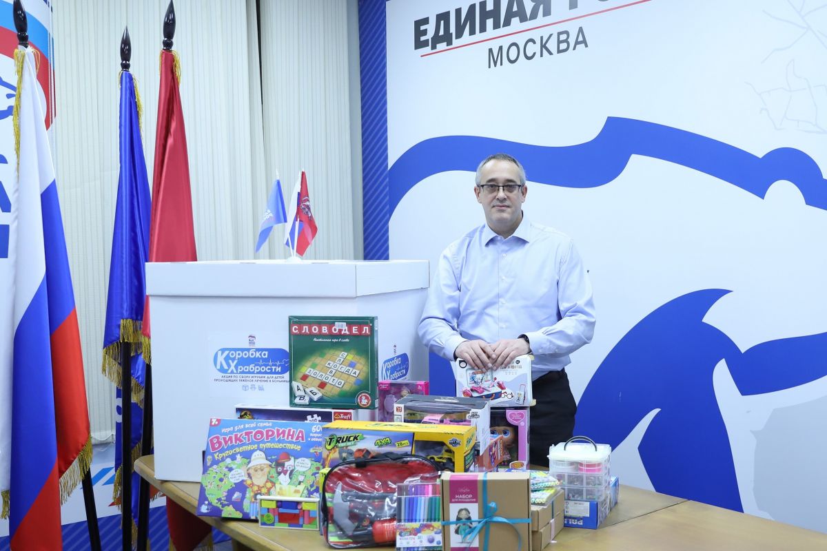 Председатель Московской гордумы Алексей Шапошников привёз игрушки, наборы для творчества и рукоделия в «Коробку храбрости» в окружном отделении партии на северо-востоке столицы.