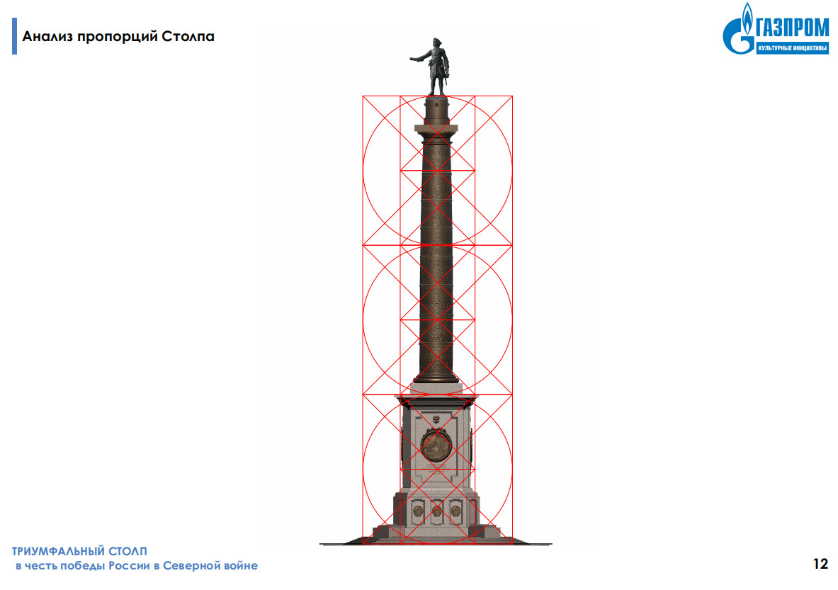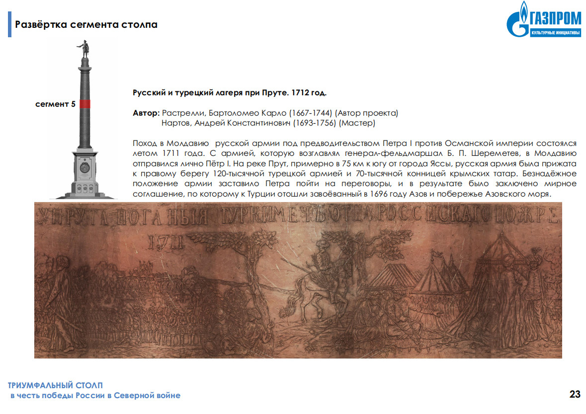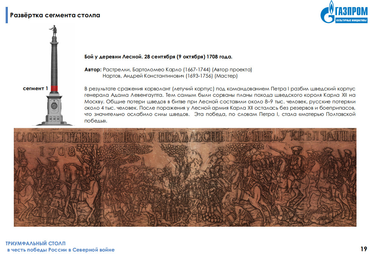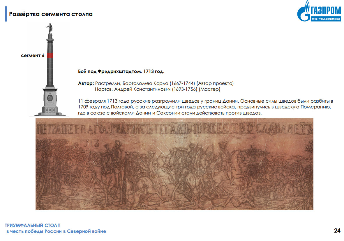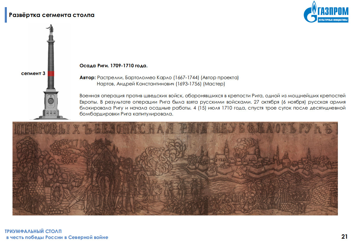 Основой триумфального столпа стала модель, которая хранится в Эрмитаже. Как пояснил Мамошин, Петр I, предвидя победу в Северной войне, дал вводную скульптору Бартоломео Растрелли (отцу Растрелли-зодчего) и скульптору, ученому Андрею Нартову заниматься работой по созданию триумфального столпа. «В двух направлениях работа велась одна: это изготовление некой коллекционной модели как элемента декоративно-прикладного искусства <...>. А второе направление шло в плане того, чтобы попытаться это все интегрировать в город», — рассказал Мамошин. Нартов для создания барельефов и медальонов привлек лучших баталистов со всей России. В Петербурге этот столп так и не появился, но в Генплане архитектора Леблона планировалось поставить его на Васильевском острове и оснастить функцией маяка. Модель в конце концов была собрана из всех существующих медальонов, работу закончили перед Великой Отечественной войной в Русском музее — она-то и хранится в настоящее время в Зимнем дворце.