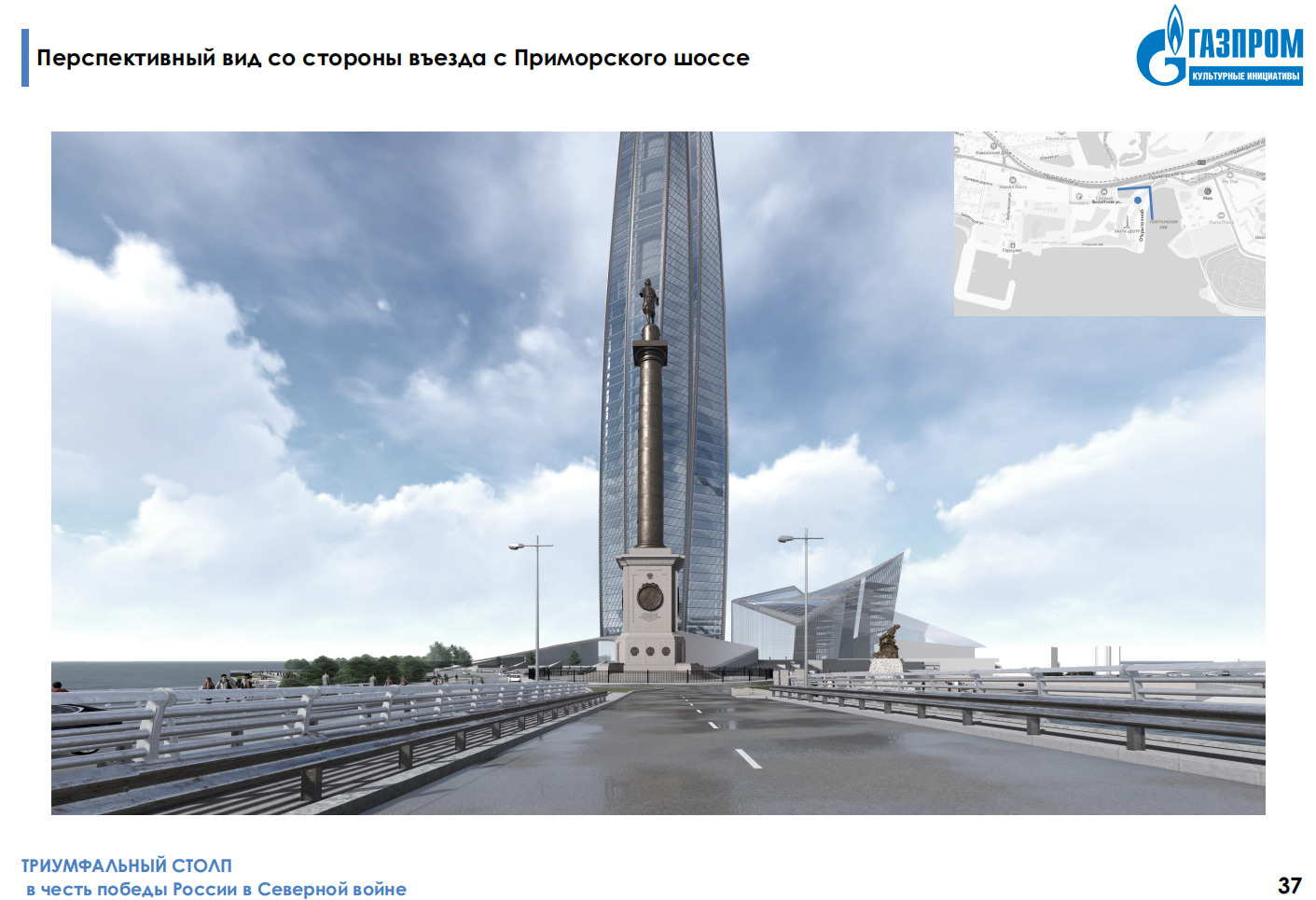 Проект создал авторский дуэт: архитектор — Михаил Мамошин, скульптор — Степан Мокроусов-Гульельми. Мамошин объяснил, что разворотная площадка была изначально, еще при строительстве Лахта Центра, зарезервирована под триумфальный столп. Петр I, венчающий колонну, встречает подъезжающих к Лахта Центру.