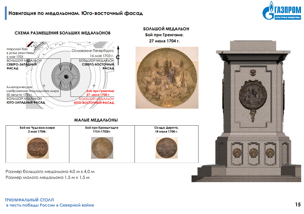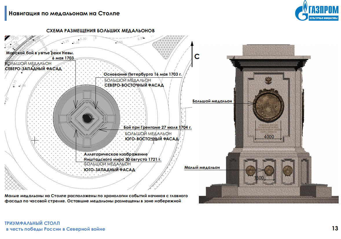 В представленном проекте пьедестал столпа тоже декорирован большими и малыми медальонами. «Это не мы все навыдумывали. Это сокровища Эрмитажа», — пояснил архитектор.