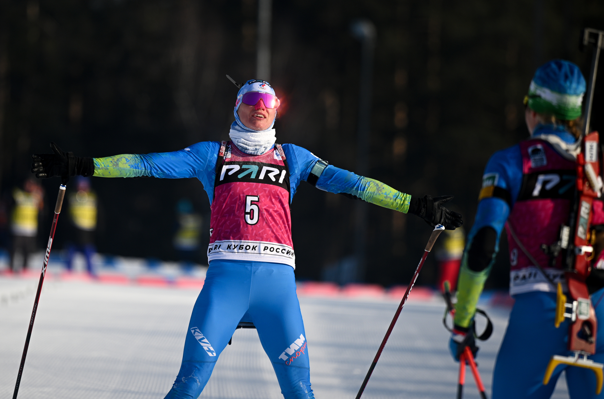 - Ирина Казакевич на финише гонки с масс-старта на 12,5 км финального этапа Кубка России по биатлону в Чайковском