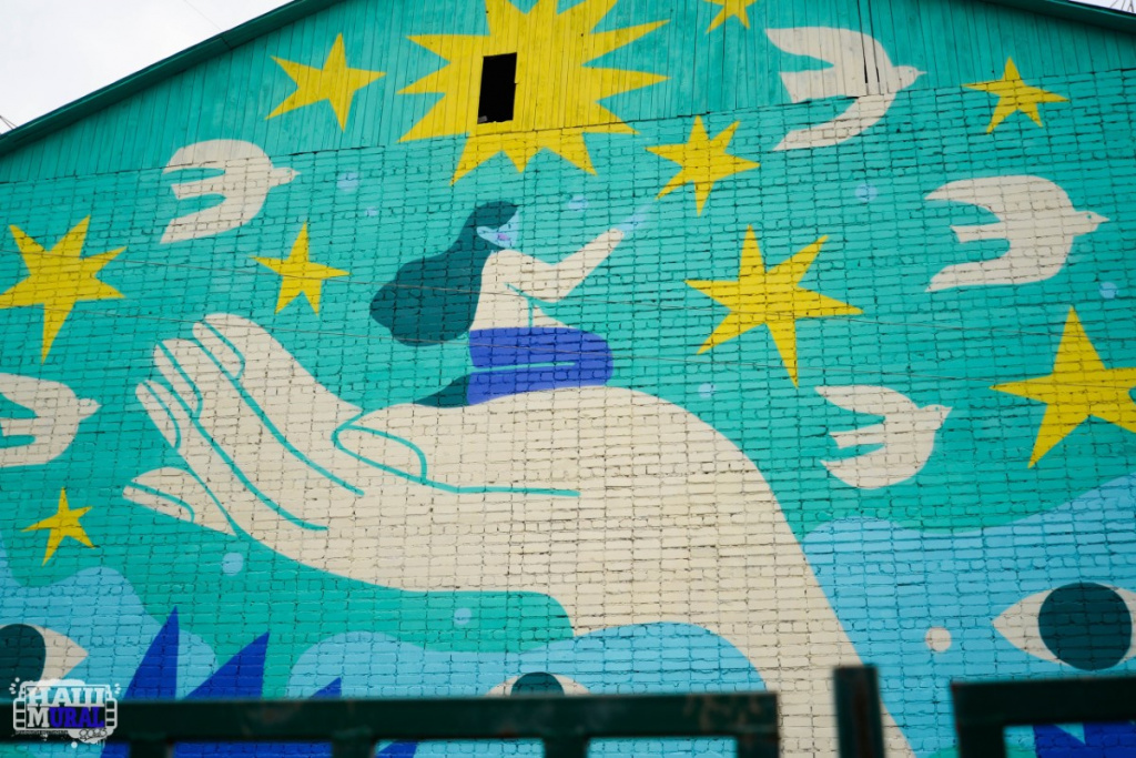 Тем временем к работе приступили участники фестиваля. Первый мурал появился в середине октября в Юрюзани. На фасад школы № 1 Николай Касаткин перенес эскиз иллюстратора Саши Люпин. По ее словам, рука, символизирующая педагога, выпускает ученицу, как птицу, во взрослую жизнь, навстречу звездам, мечтам и достижениям.