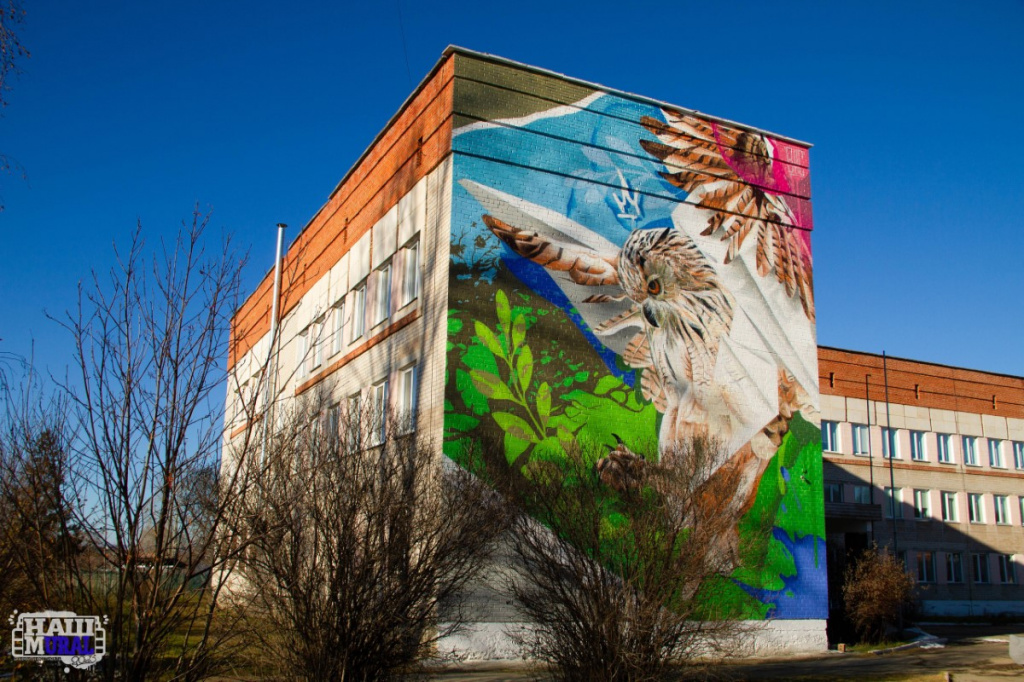 Один из самых красочных муралов появился в Миассе. Огромную сову на фасаде школы № 14 изобразил пермский художник Висмут Тляшев, использовав 150 баллонов аэрозольной краски.