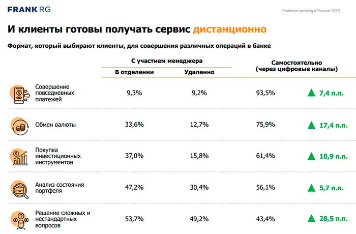 Кирилл Варенцов считает, что «сейчас скорее можно говорить о нормализации, то есть о возврате к комбинированному формату коммуникации после периода преобладания онлайн-обслуживания». Он тоже убежден, что люди готовы решать многие вопросы, в том числе связанные с покупкой финансовых продуктов, посредством цифровых каналов, но «по итогам первичной консультации с премиальным менеджером».