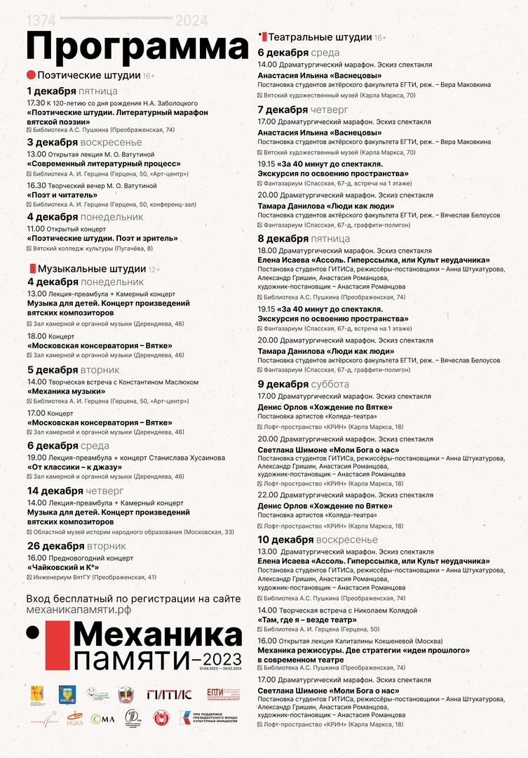 Помимо театральной, в рамках проекта «Механика памяти — 2023» будут реализованы музыкальная, поэтическая и традиционная просветительская программы. Так, с мая по сентябрь оргкомитет принимал заявки от молодых поэтов в возрасте от 18 до 35 лет на участие во Всероссийском семинаре молодых литераторов «Поэтические штудии», посвящённом 120-летию Н.А. Заболоцкого, который пройдёт в г. Кирове и г. Уржуме с 1 по 5 декабря 2023 г. Цель отбора — выявить одарённых российских поэтов и наметить векторы развития современной поэзии, основанной на традициях русской поэтической школы, ярким представителем которой является Николай Алексеевич Заболоцкий. Программу реализует Кировское отделение Союза писателей России и партнёр проекта – Совет молодых литераторов Союза писателей России. 4 декабря в Вятском колледже культуры состоится открытый концерт «Поэтические штудии. Поэт и зритель». География участников обширна – в концерте примут участие молодые поэты из Кирова и Кировской области, а также из Москвы, Санкт-Петербурга, Иркутска, Вологды, Краснодарского края, Воронежской, Курской, Белгородской, Владимирской областей и других регионов.Прочтут свои стихи также и руководители поэтического семинара – председатель Кировского отделения Союза писателей России Андрей Антонов, член Союза писателей Москвы, поэт Мария Ватутина (г. Москва) и член Союза писателей России, поэт Ксения Савина (г. Санкт-Петербург). Кроме того, в рамках программы состоится большой творческий вечер и лекция Марии Ватутиной в Библиотеке имени А.И. Герцена, а 1 декабря в Библиотеке имени А.С. Пушкина – литературный марафон вятской поэзии «Поэтические штудии», на котором поэты из регионов РФ познакомятся с творчеством кировских поэтов, членов Союза писателей России Елены Наумовой, Николая Пересторонина, Андрея Антонова, Натальи Кузницыной, Евгения Изместьева, Елены Коноваловой, Александры Мочаловой.