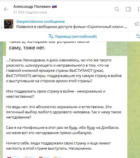 И собственно, что в этой истории самое странное? Александр Пелевин, писатель и публицист, справедливо отметил, что ничего ужасного и шокирующего в том, что на главной книжной ярмарке России будут авторы, поддержавшие армию, нет.