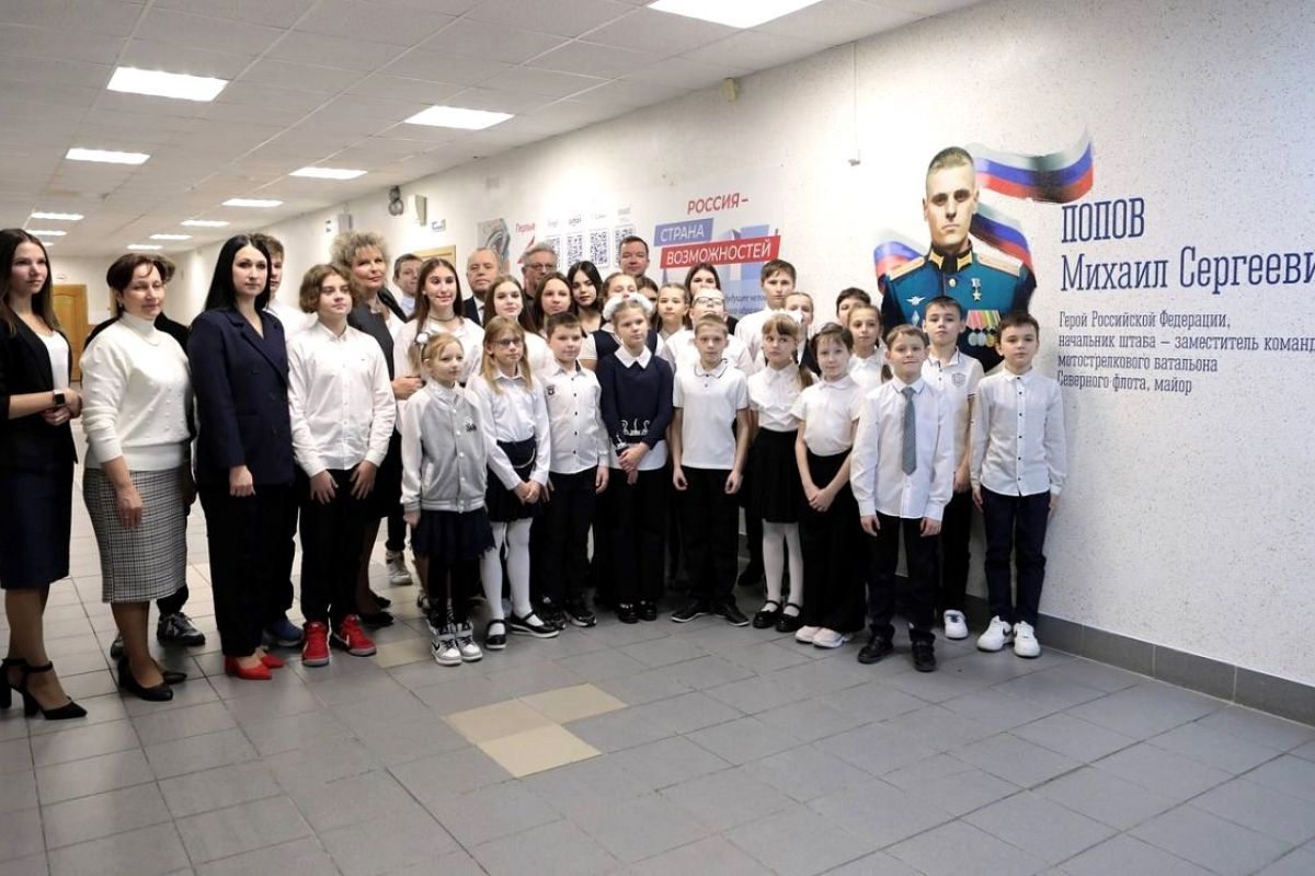 В школе №289 Заозёрска открыли мурал в честь земляка, Героя России Михаила Попова.