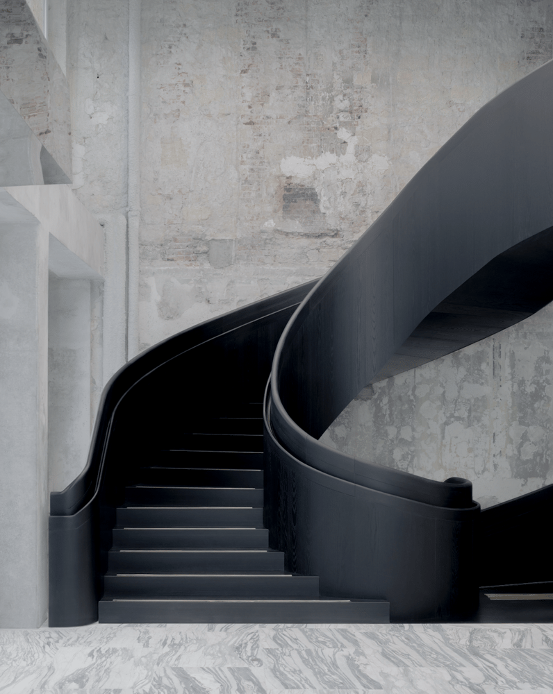 Такая концепция интерьера для бренда абсолютно нова. В просторном помещении присутствует «напряжение между шероховатыми текстурами и точными деталями», что создает «новую парадигму для среды люксового шопинга».