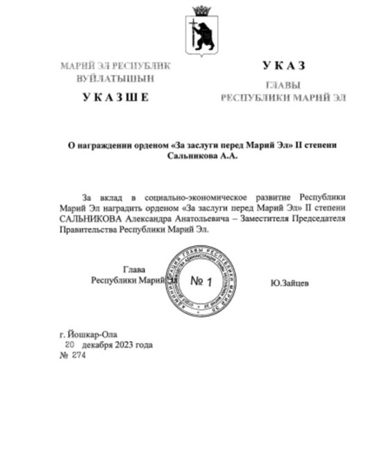 Заместитель Председателя Правительства Марий Эл Александр Сальников награжден орденом «За заслуги перед Марий Эл» второй степени.