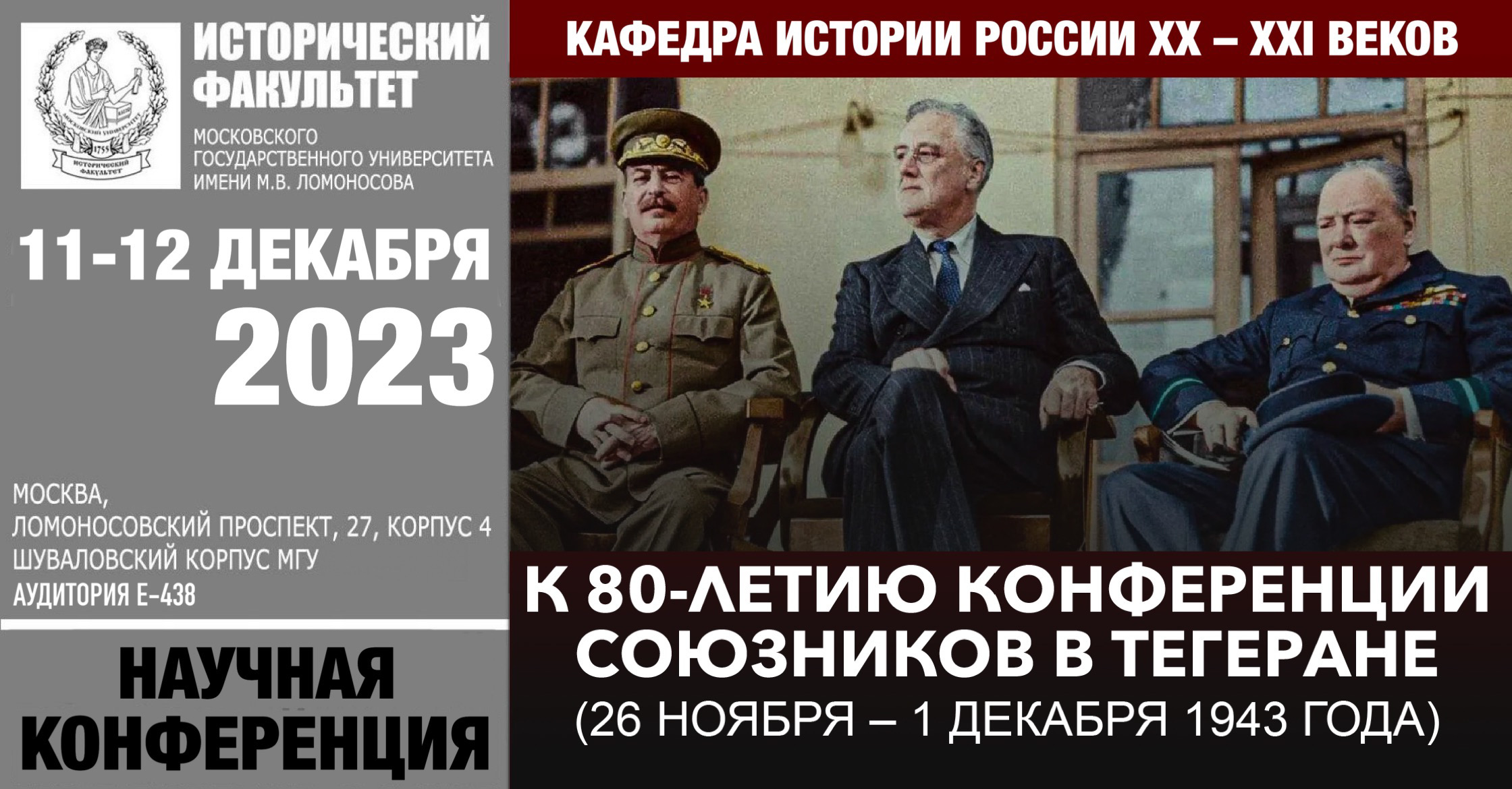 11-12 декабря 2023 года на базекафедры истории России XX-XXI вековисторического факультета МГУ прошла международная конференция "К 80-летию конференции союзников в Тегеране (28 ноября – 1 декабря 1943 года)".